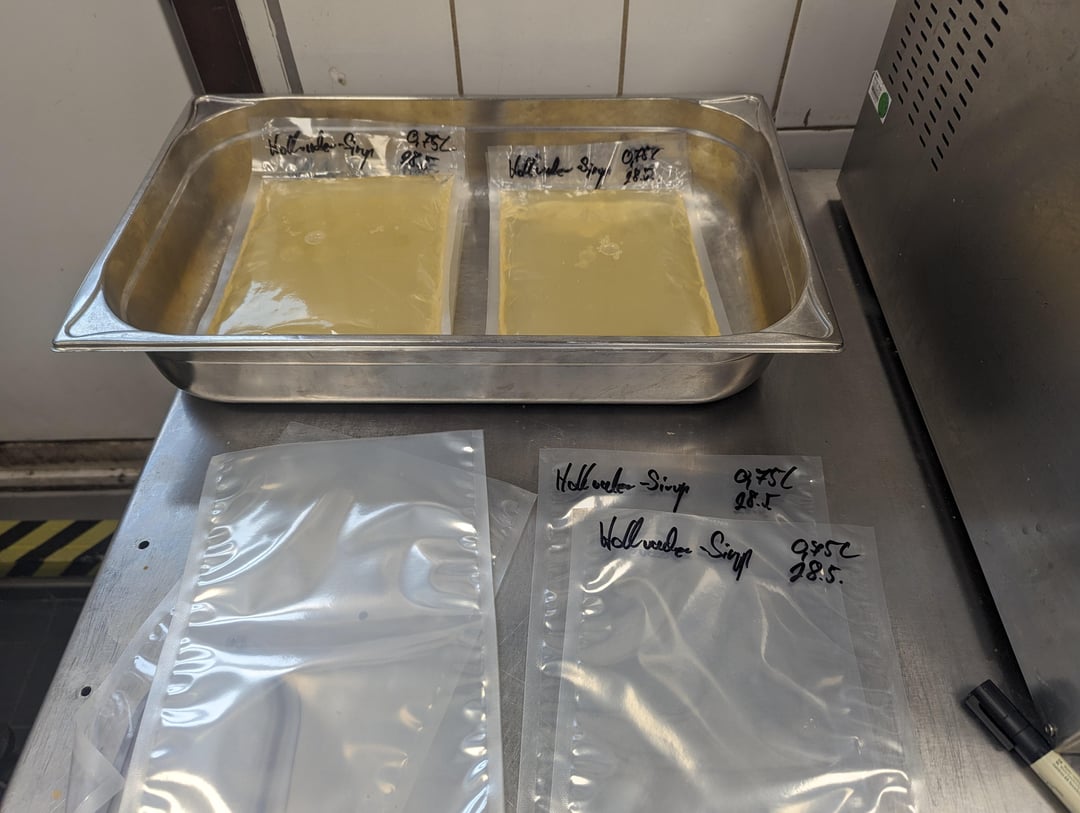 Habe den Bums kalt Abgefüllt und eingefroren. Man kann ihn auch heiß, in sterilen Gefäßen abfüllen und bei Raumtemperatur lagern. Dann eine Nacht stehen lassen und erneut aufkochen.