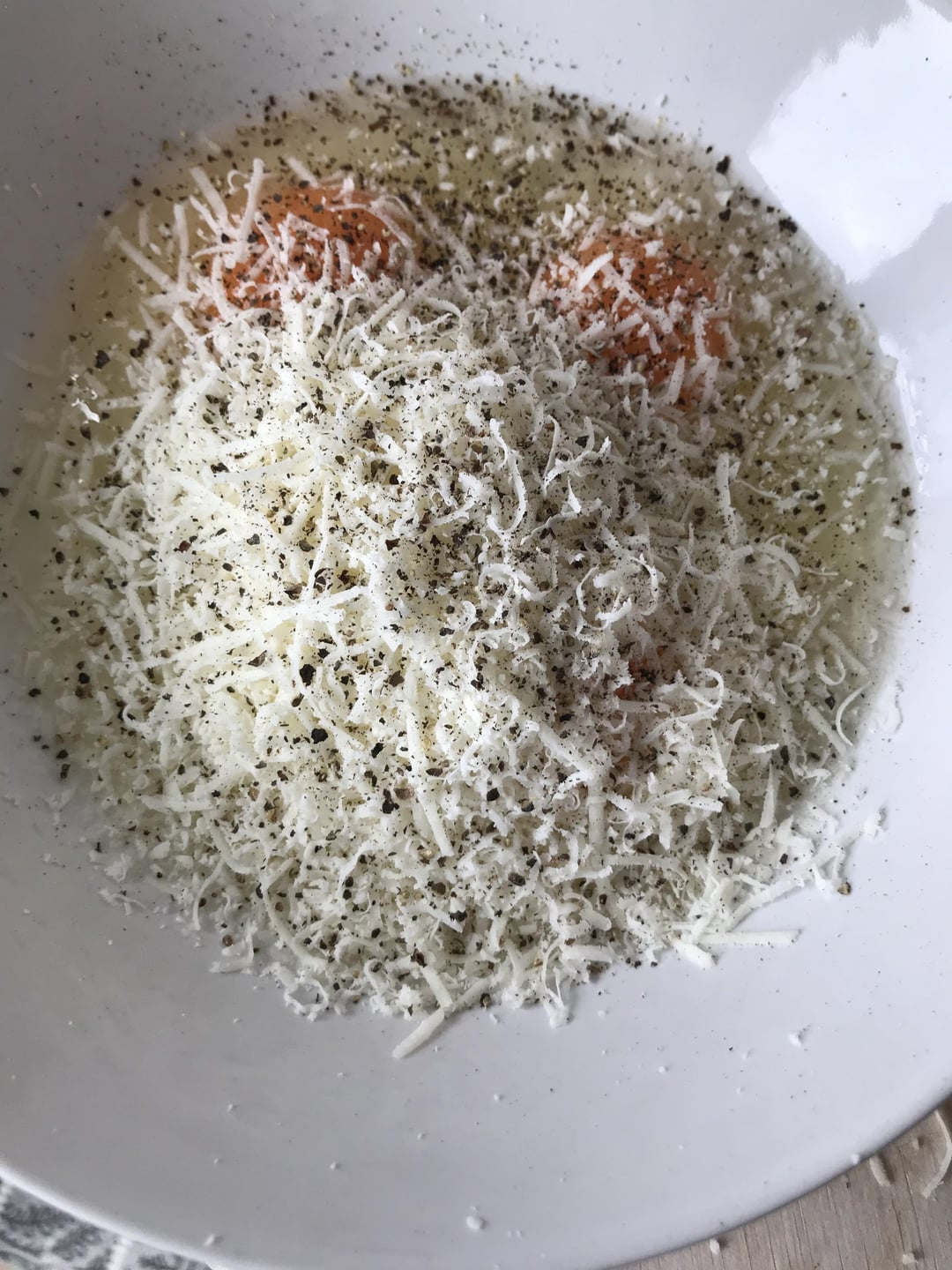 While the Guanciale is cooking prepare the eggs (whole) with pecorino cheese and black pepper.
