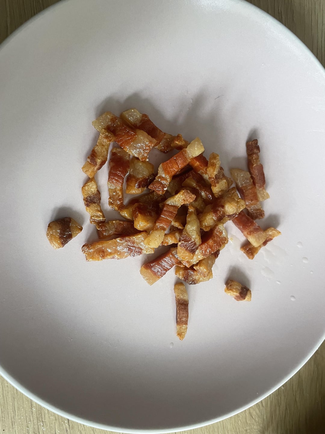 Sobald der Guanciale eine rötliche Farbe angenommen hat, nehmen Sie ihn aus der Pfanne.
