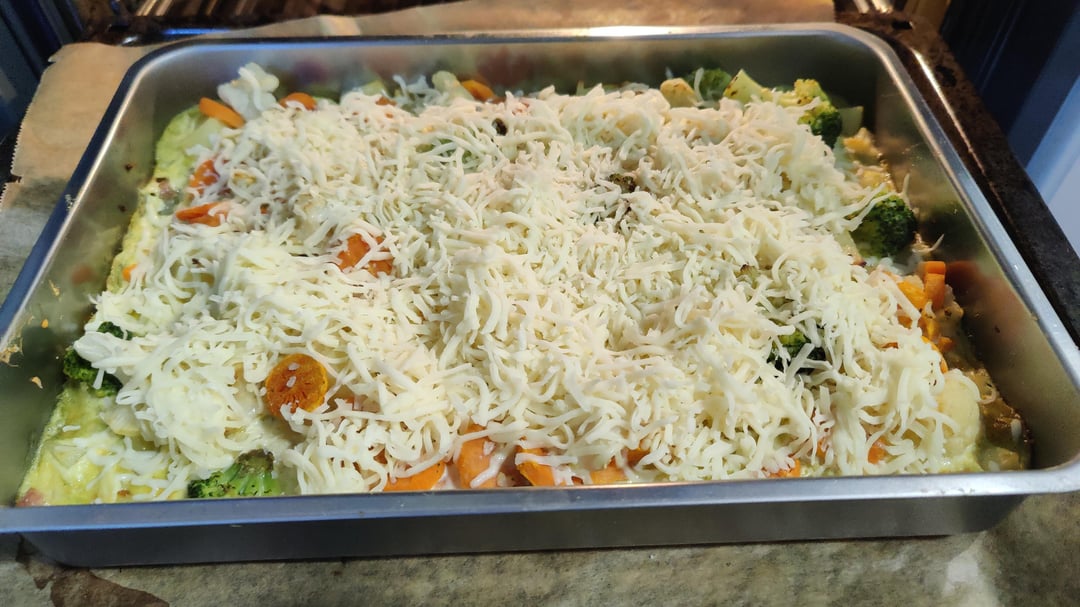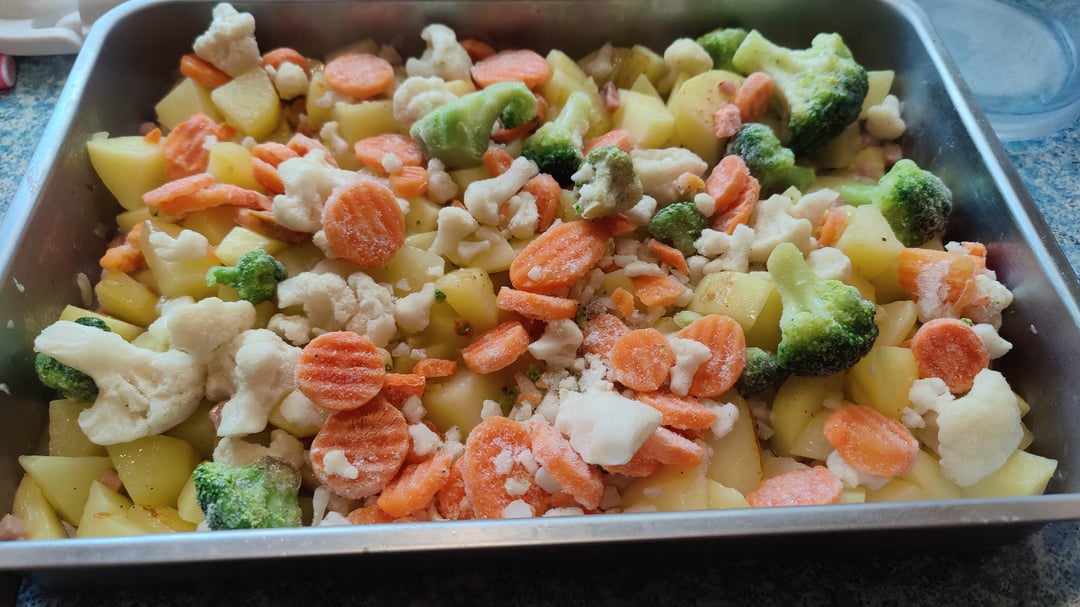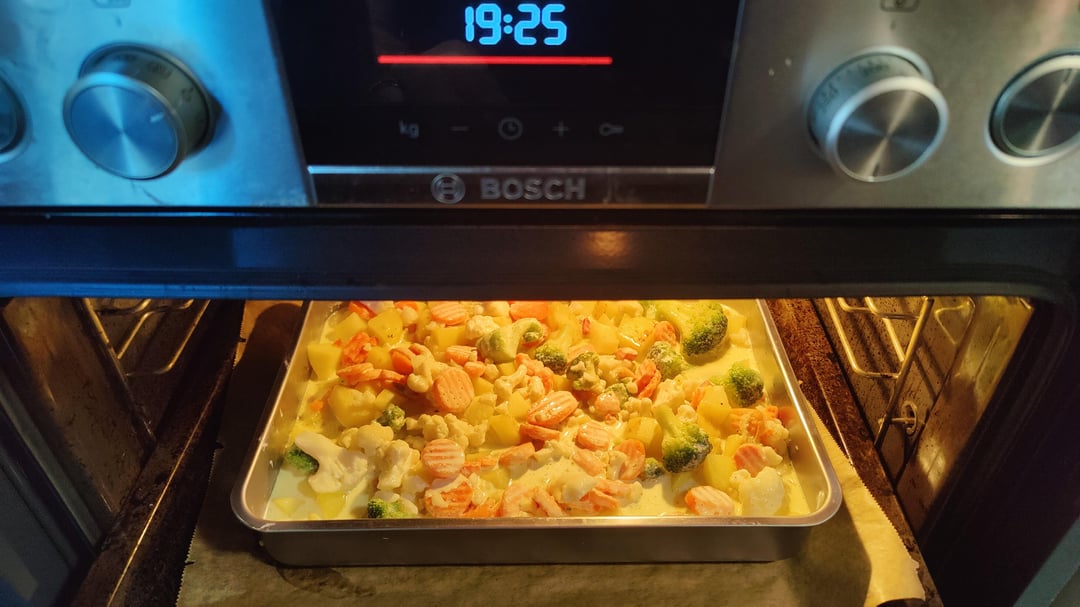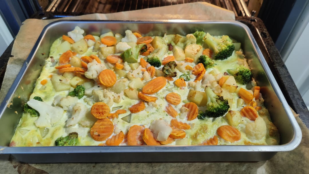 Wenn die Kartoffeln soweit sind, in eine Auflaufform geben, das Gemüse drüber verteilen und mit der Sahnemischung übergießen.