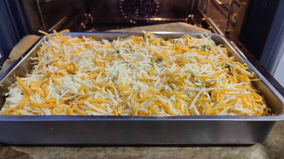 Zum Schluss mit Käse bedecken und noch mal mit der Grillfunktion oder alternativ Oberhitze auf 250 Grad befeuern.