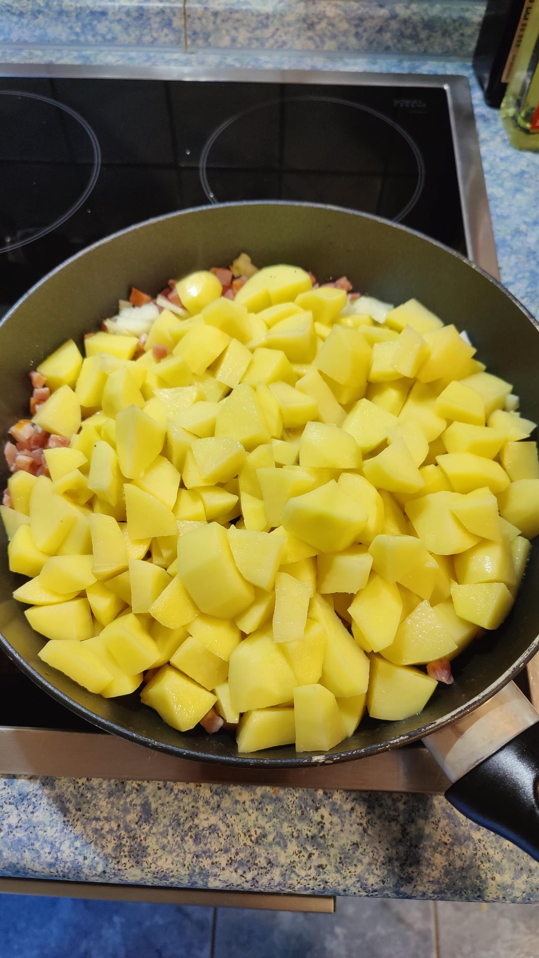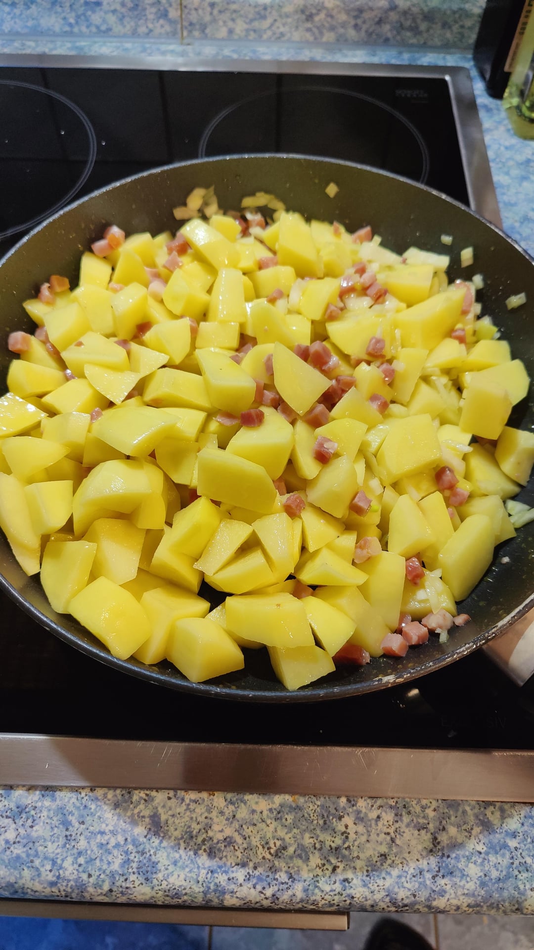 Die Zwiebeln und Kartoffeln würfeln und zusammen mit dem Schinken anbraten. Eine leichte Bräunung ist gewünscht, aber nicht durchbraten.