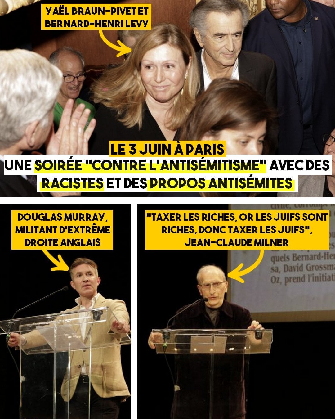 Je mets pas vraiment ça pour mettre une pièce de + dans les délires symétriques “l’antisémitisme n’est que résiduel” ou “il faut soutenir toute personne se battant contre l’antisémitisme” (textuellement j’ai lu ces deux trucs chez des gauchistes reddit cette semaine) ; mais + pour montrer l’axe islamophobie – capital – philosophes conservateurs. La présidente de l’Assemblée nationale était convive de la soirée.