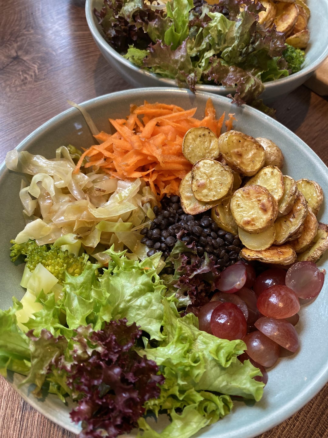 Die restlichen Zutaten: Salat, Weintrauben, Möhren, Brokkoli – zupfen, halbieren, raspeln und kochen.