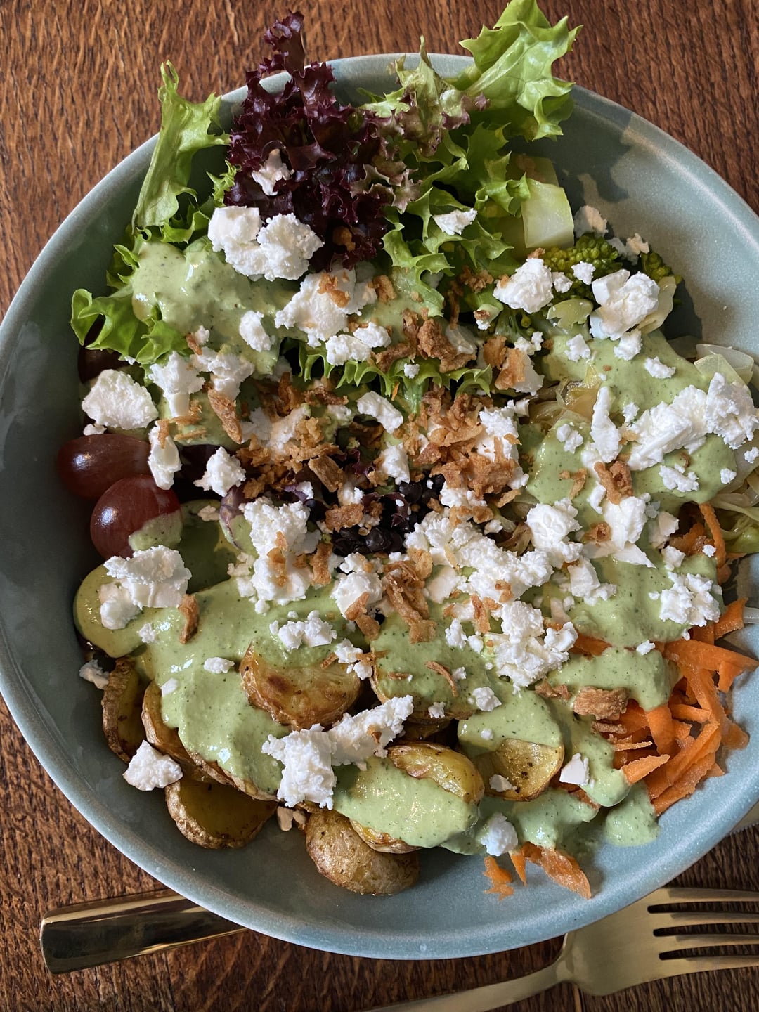Dann alles zusammenpacken, Soße drüber und noch mit Feta und Röstzwiebeln toppen. Macht richtig satt und schmeckt gut.