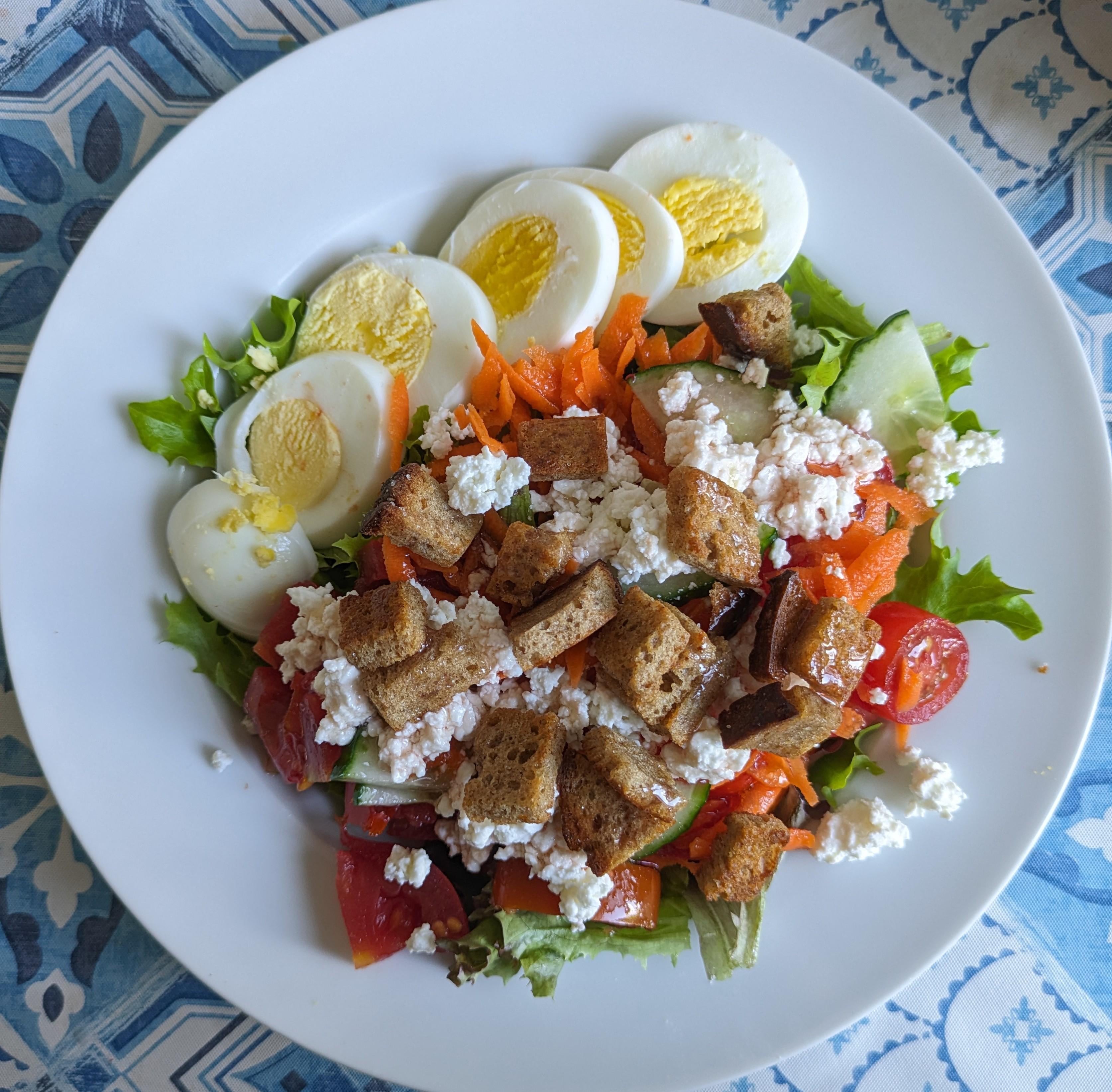 Heute Abend gab es Pflücksalat mit Gurke, Möhre, Datteltomaten, Ei, eingelegten Tomaten, Tworog (russischer Quark, Mischung aus Hüttenkäse und Feta, aber weniger salzig), selbstgemachten Croutons und Himbeer-Vinaigrette. Abgebildet ist eine halbe Portion. Hatte danach noch einen Teller voll. Ü