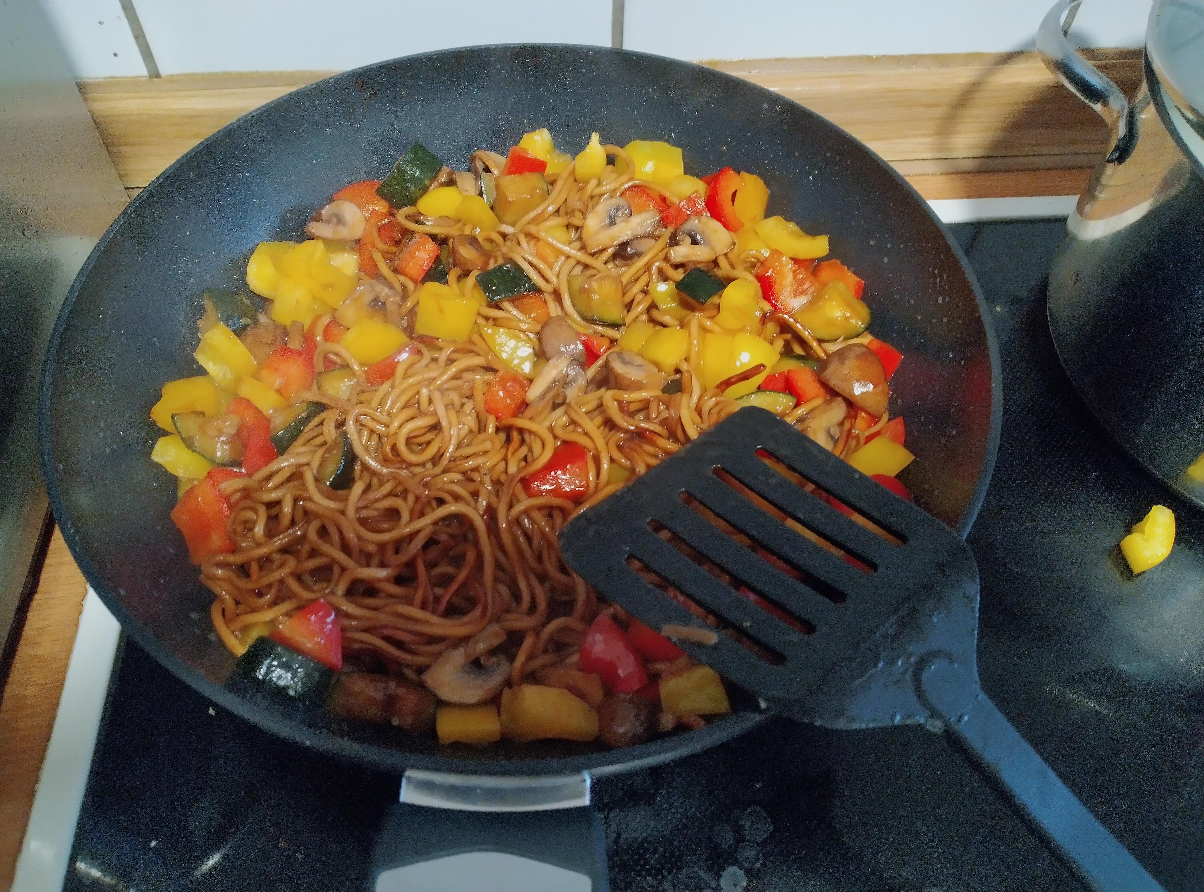 Gemüse nach Wahl kleinschneiden und anbraten, Quick Cooking Nudeln kochen, zum Gemüse geben und die Sauce unterrühren.