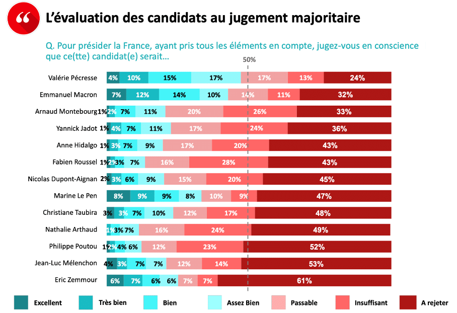 Personnellement, si Macron bat Pecresse en second tour éventuel, je trouverais ça injuste qu’elle gagne avec le jugement majoritaire, mais aucun scrutin n’est parfait. Le scrutin uninominal reste cependant le pire, vu qu’on doit encourager les gens à ne pas se présenter (le drama JLM-Hamon en 2017, et ça va clairement se reproduire puissance 1000 cette année). C’est très anti-démocratique.