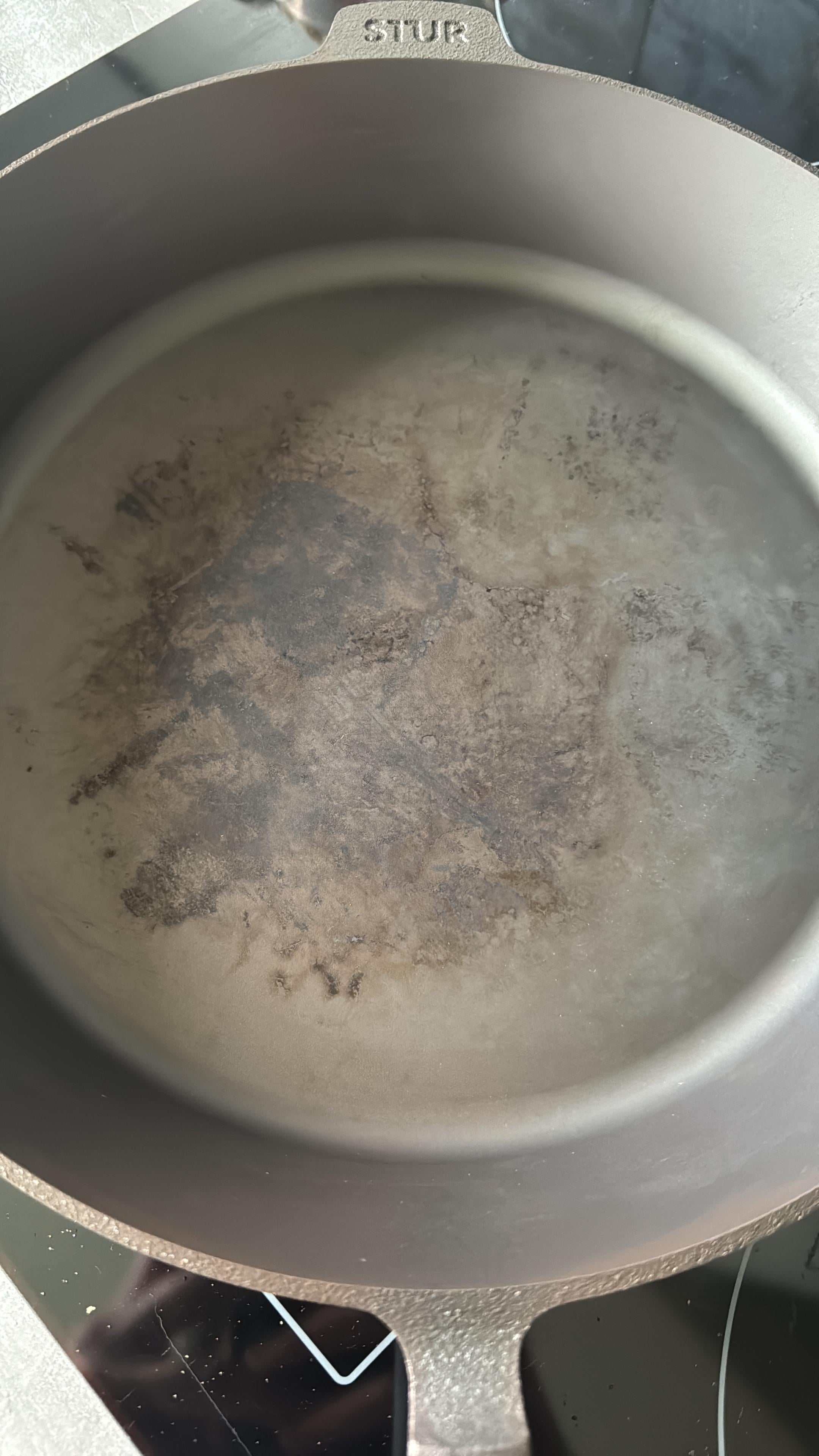 Das es etwas angebrannt ist macht nix. Aber die Pfanne ist definitiv nicht im richtigen Zustand.