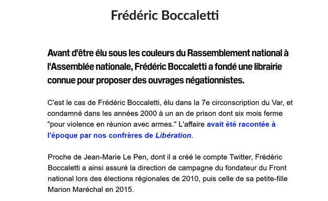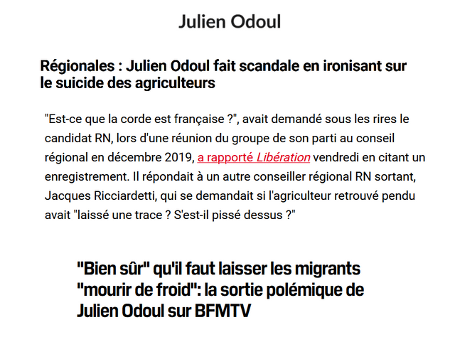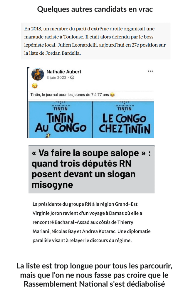 Parce que les accusations tirées par les cheveux des rares candidats noirs et arabes véritablement issus de la société civile des quartiers font les gros titres mais les saillies littéralement fascistes des cadres du RN sont minimisées, tues ou ignorées.