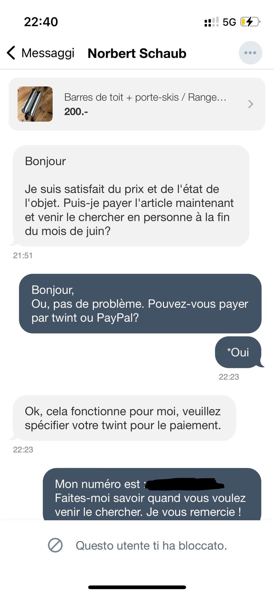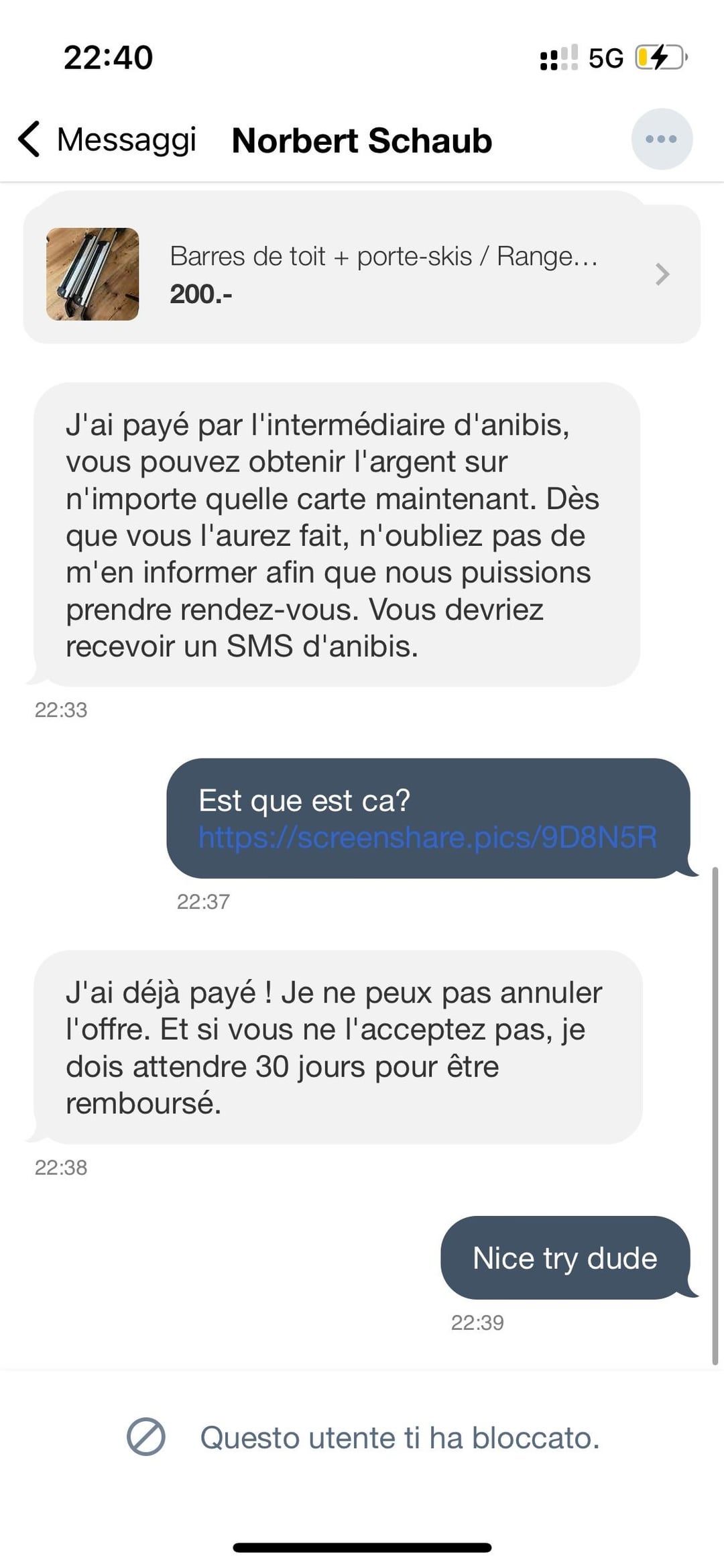 I therefore decided to send my phone number. Of course he replied that there was an issue and that anibis would have sent me a message. At that point I was sure it was some sort of scam.