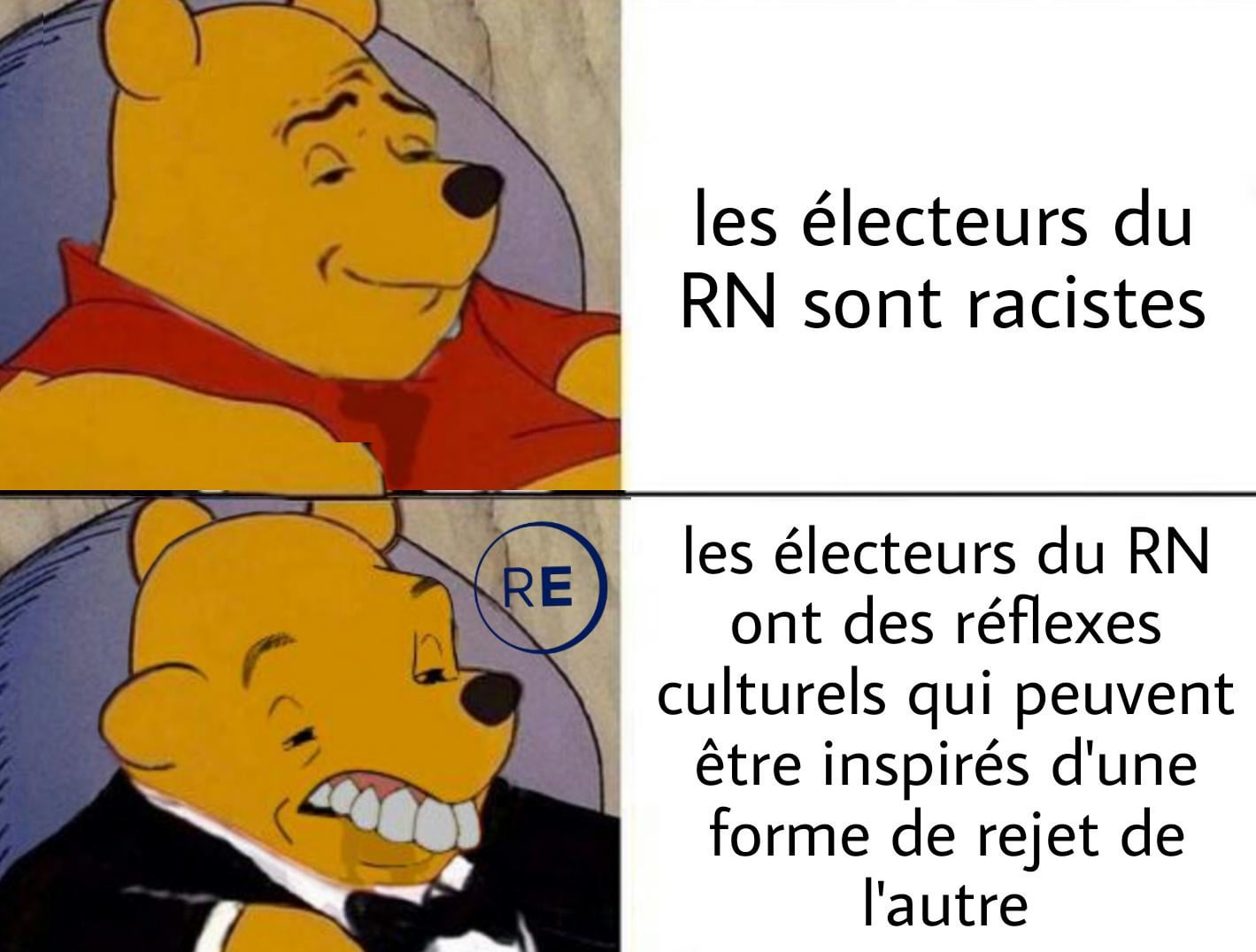 C est pas pareil hein by ladandur Tags:Actu memesfranceMemes 6 comments https://preview.redd.it/hv2vn763cv8d1.jpeg?width=1080&format=pjpg&auto=webp&s=4804deb4ce1e51558bfc76af54b6cf769b2640d3 *ce sont les mêmes images* Les électeurs du RN votent just pour emmerder l’élite C’est antisémite de dire “raciste”. /s Plop, je suis militants PCF depuis des années et je ne considère pas les électeurs RN comme des racistes. Néanmoins ce n’est pas du racisme conscientisé, ni politique. C’est trop facile de les réduire à ça et c’est passé a la trappes plein d’autres facteurs socio économiques qui pousse au vote RN. Je ne sais pas si c’est vrai de tous, je pense que certains sont très attachés aux traditions et ont peur qu’elles soient supplantées par d’autres, mais le fait que historiquement avec les différents mouvements de populations etc les traditions évoluent, donc je pense qu’il y a une peur teintée de « c’était mieux avant ». Leave a ReplyYou must be logged in to post a comment.