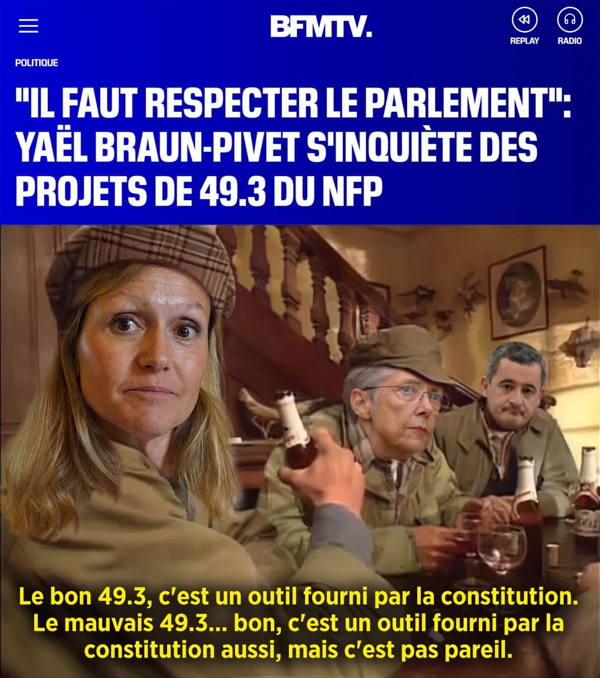 2. Est-ce que c’est juste une manœuvre de communication pour faire peur aux français ou est-ce que cette dame ne comprend pas le principe du 49.3 ? Si le NFP veut faire un 49.3 dans cette configuration de l’Assemblée, on aura une belle motion de censure rapidement votée…