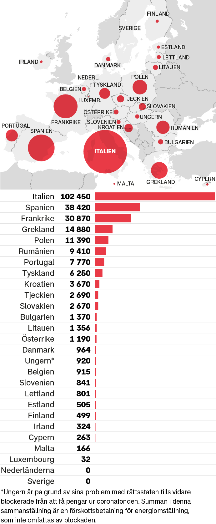 Mikael Damberg påpekar att 2021, innan riksdagsvalet, var sju av åtta partier eniga om reduktionsplikten. Bara SD var emot. Italien har fått mest ur coronafonden I coronafonden finns 648 miljarder euro avsatta i lån och bidrag till de 27 EU-länderna. Till och med 15 juli har drygt 240 miljarder euro betalats ut. Nederländerna väntas få sin första utbetalning inom kort. Sverige är enda EU-land som ännu inte begärt ersättning ur fonden. 3,45 miljarder euro finns avsatta till Sverige. (Miljoner euro)