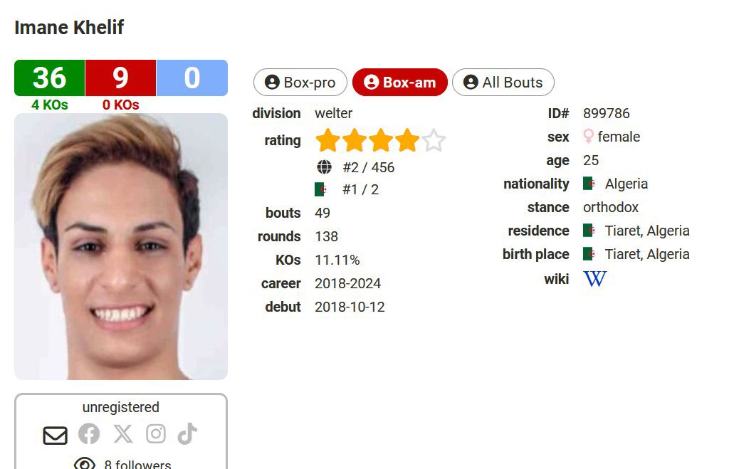 Στους Ολυμπιακούς του Τόκυο το 2020 έχασε από μία Ιρλανδή πυγμάχο στον προημιτελικό και δεν κέρδισε μετάλλιο. Στην καριέρα της έχει 38 νίκες και 9 ήττες όλες σε αγώνες με άλλες γυναίκες πυγμάχους οπότε δεν την λες και ανίκητο θηρίο τεστοστερόνης. Η ίδια έχει περίπου 4 νίκες ανά ήττα και η Ιταλίδα αντίπαλος της γύρω στις 3,5 νίκες ανά ήττα.