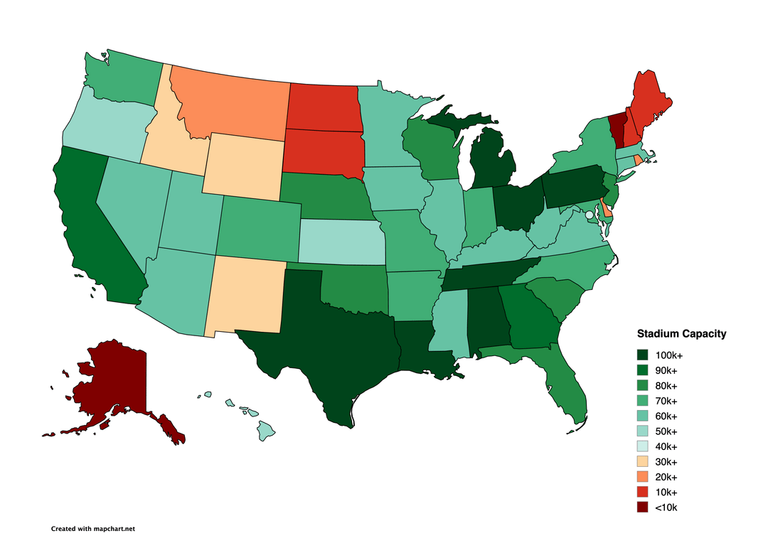 In some cases there are conflicting sources on the capacity of a stadium. In this case, the larger value has been used. This map does not count indoor arenas as stadiums, and excludes temporary/concert seating for calculation of capacity
