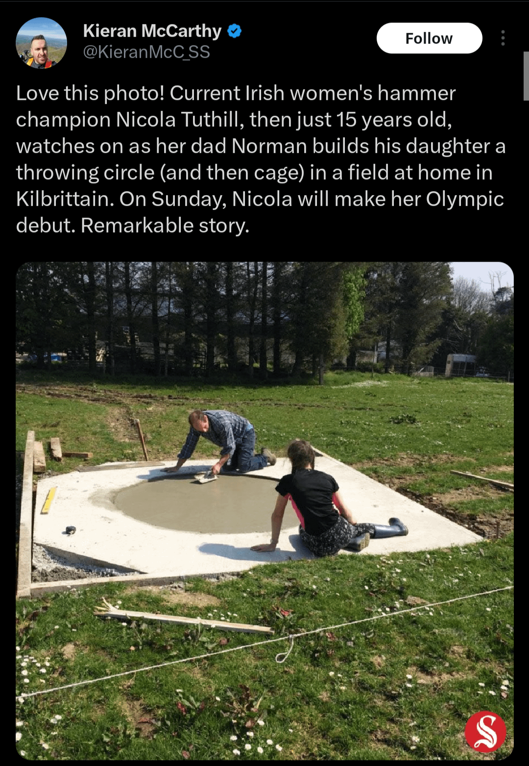 3. Man this is class. I’ve little knowledge of athletics in Ireland, but how easy is it to find facilities for some of these more obscure track and field events? Does every club have a pool for steeplechase or a cage for hammer throwing?