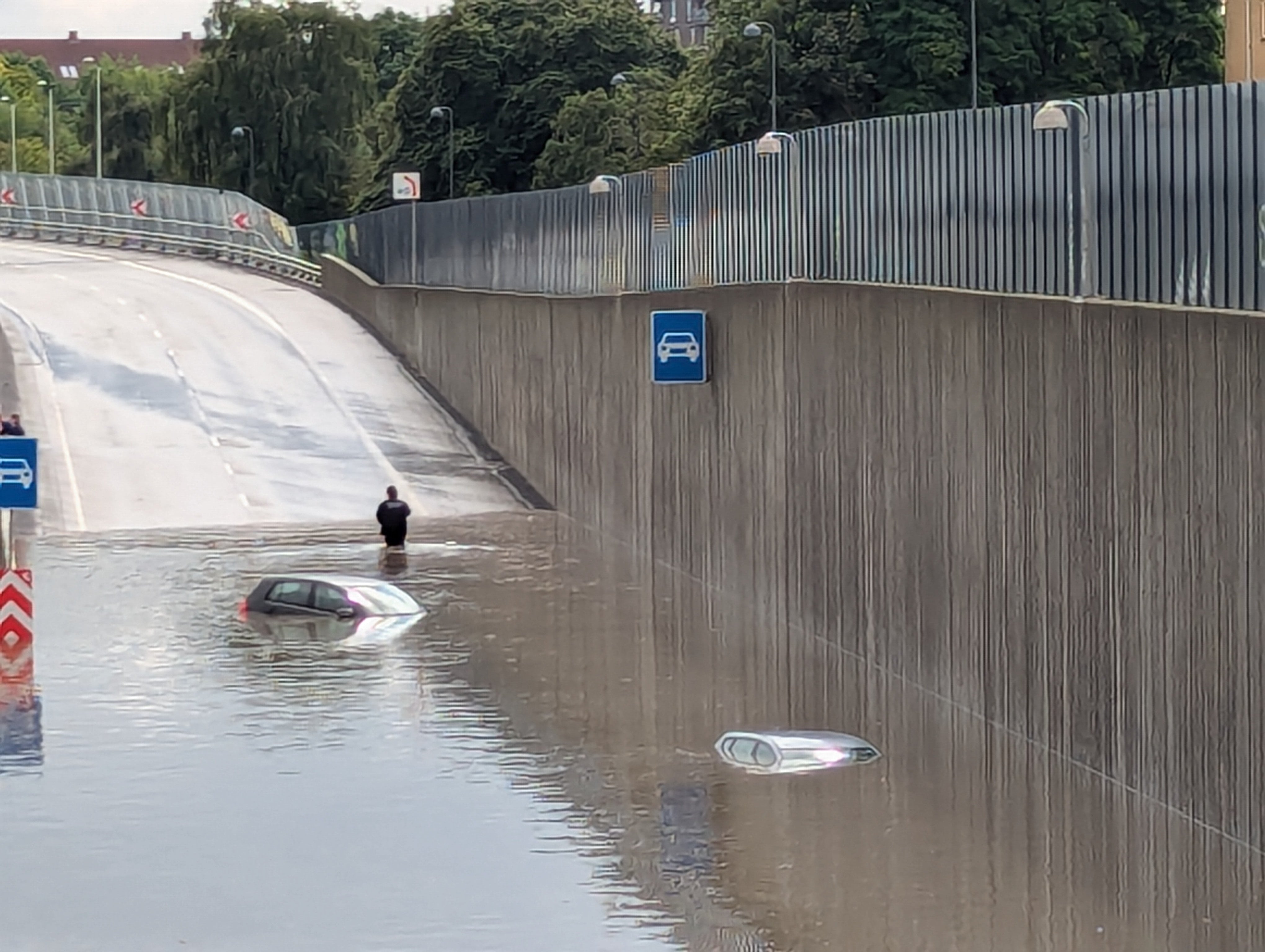 Vandet kommer op ad kloakkerne, dækslerne springer op og vandet kommer med overraskende hastighed, man kører ned til lidt vandpytter og pludslig stiger vandet.