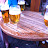 2. Under his white coat, the kid wears a blue T shirt with horuzontal stripe, the blurred face is smiling, in his hand is holding an elongated sharp metal object.