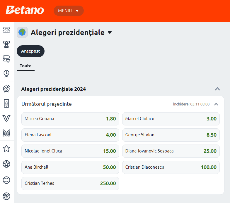 Casele de pariuri au publicat cotele pentru candidații la prezidențiale: Geoană 40%, Ciolacu 24%, Lasconi 18%, Simion 8%, Ciucă 3%, Șoșoacă 1%