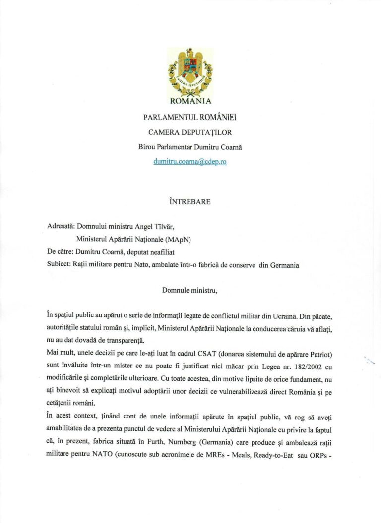 > Deputatul Dumitru Coarnă [a adresat o interpelare](https://www.cotidianul.ro/wp-content/uploads/2024/07/20/1-768×1056.jpg) către Ministerul Apărării condus de Angel Tîlvăr în care i se solicită ministrului să clarifice informațiile care circulă în spaţiul public referitor la producerea de rații militare cu etichetă în limba română