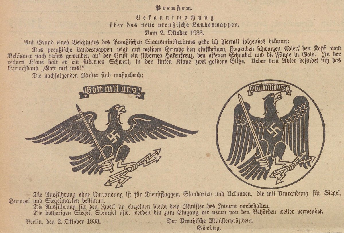 >Im Gegensatz zur Flagge in der Zeit der Weimarer Republik hält der Adler auf der NS-Flagge in der rechten Klaue ein Schwert, in der linken Klaue zwei Blitze. Zudem befindet sich der preußische Wahlspruch »Gott mit uns« auf der Flagge. Auf der in Schnellroda präsentierten Flagge fehlt lediglich das Hakenkreuz.