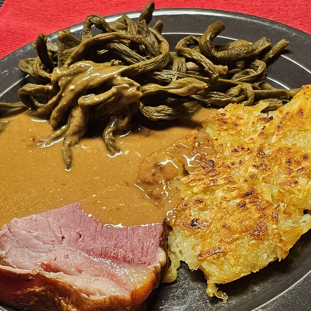 Smoked Schäufele with dried beans cooked in the slow cooker for 10 hours, served with homemade rösti and a slightly spiced up gravy