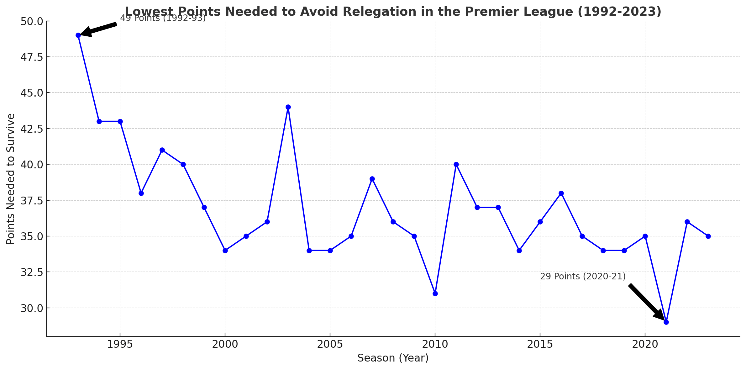 The lowest number of points needed to survive: 29 points (2020-21)