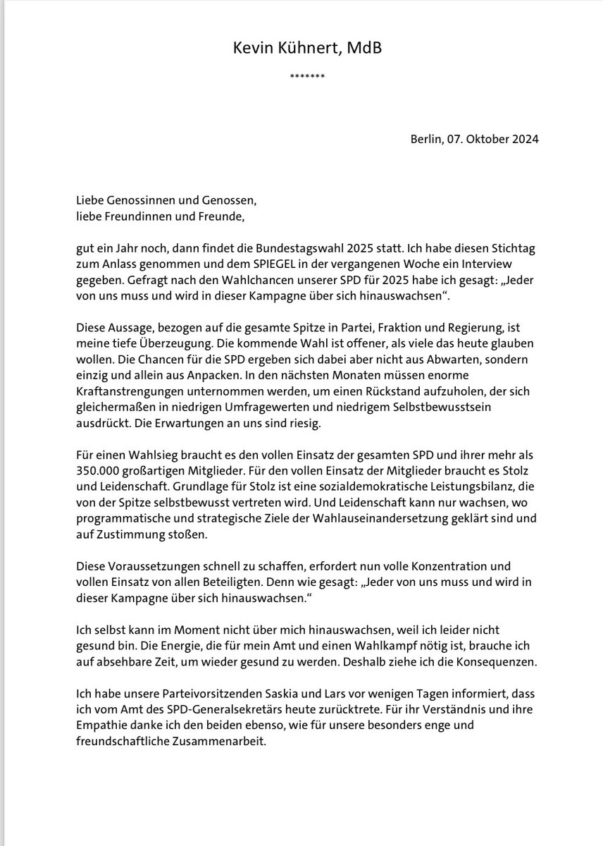 >*** Breaking: Kevin Kühnert tritt als SPD-Generalsekretär zurück *** Quelle: Politico
