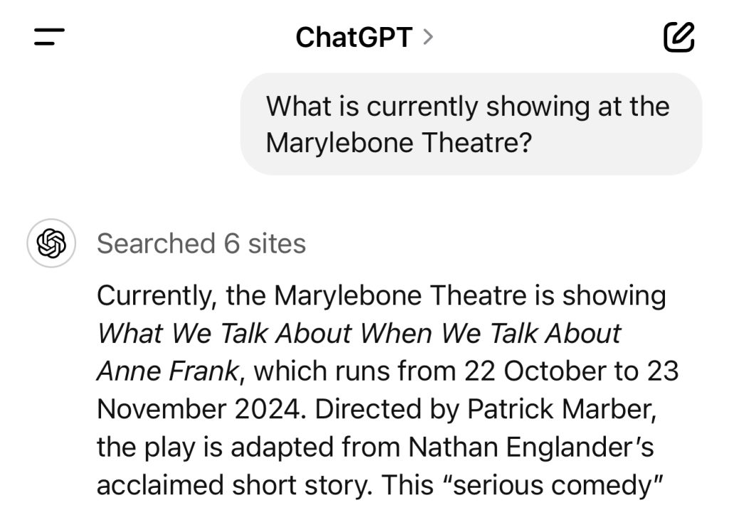 ChatGPT, in contrast, gives me the US dollar rate, and has no problem answering the theater question, also providing helpful information about the play.