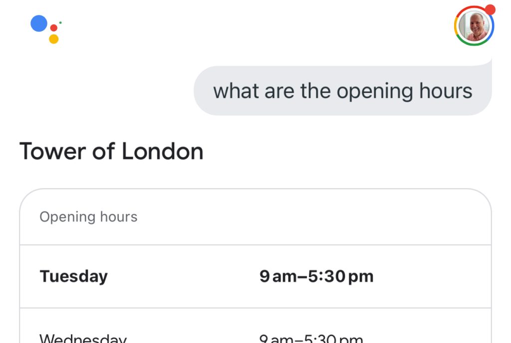 Second, when I ask the follow-up question, the assistant understands the context. It gives me a spoken reply on today’s opening hours, and displays on screen the hours for the rest of the week.