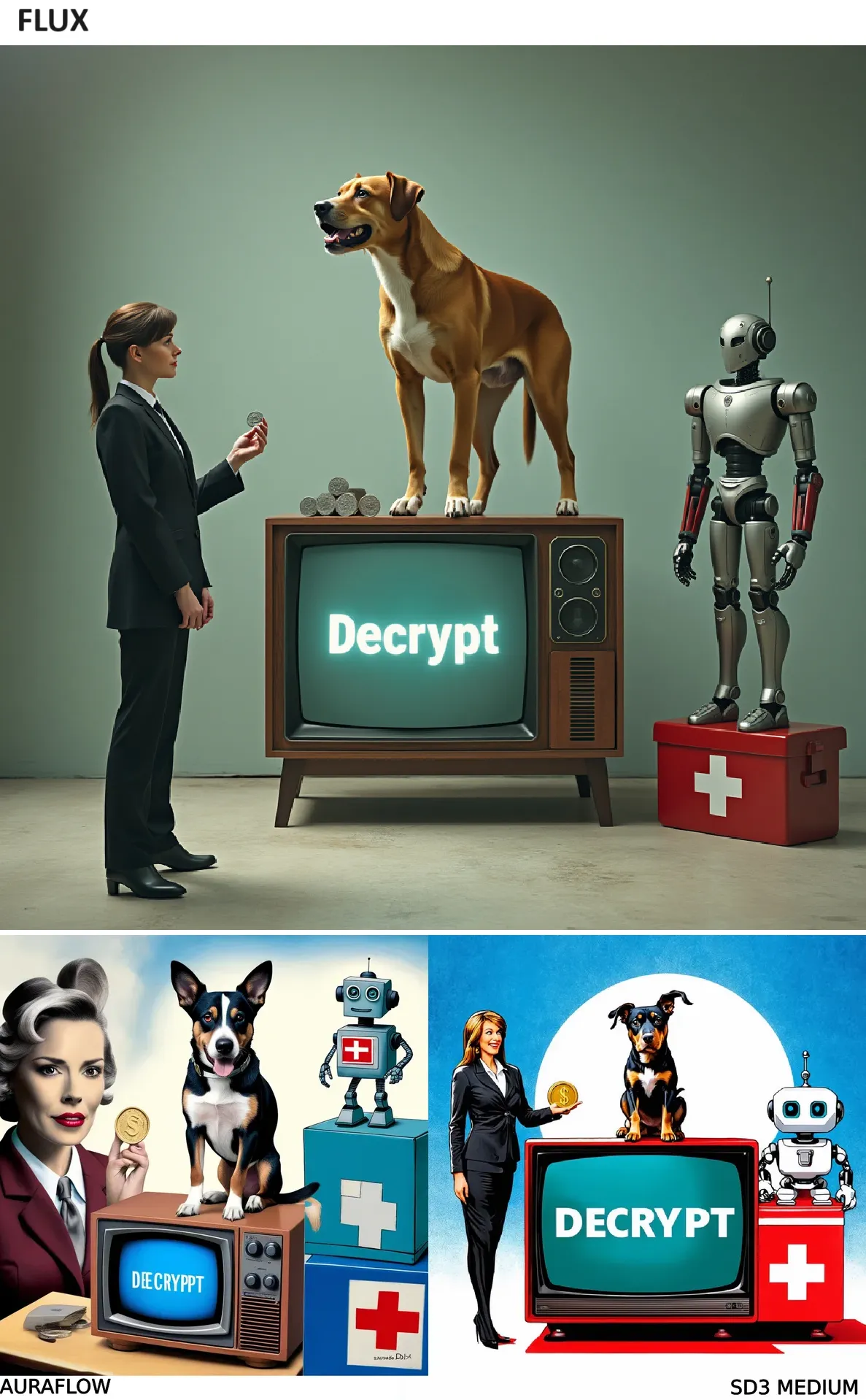 Prompt 5: “A dog standing on top of a TV showing the word ‘Decrypt’ on the screen. On the left there is a woman in a business suit holding a coin, on the right there is a robot standing on top of a first aid box. The overall scenery is surreal.”