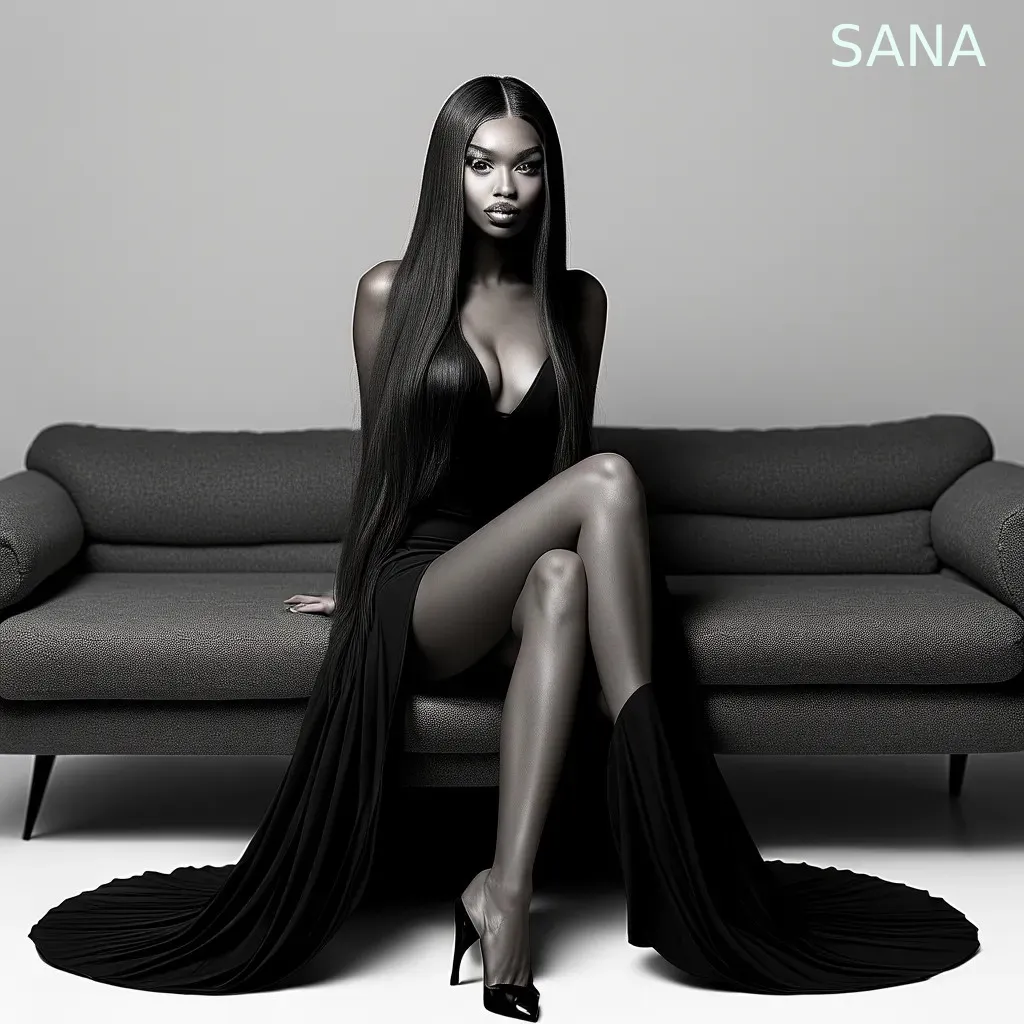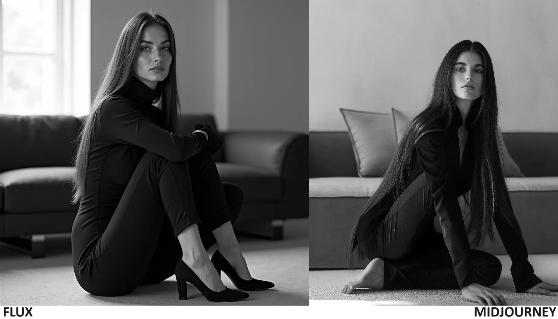 Prompt 2: A black and white photo of a woman with long straight hair, wearing an all-black outfit that accentuates her curves, sitting on the floor in front of a modern sofa. She is posing confidently for the camera, showcasing her slender legs as she crouches down. The background features a minimalist design, emphasizing her elegant pose against the stark contrast between light gray walls and dark attire. Her expression exudes confidence and sophistication. Shot by Peter Lindbergh using Hasselblad X2D 105mm lens at f/4 aperture setting. ISO 63. Professional color grading enhances the visual appeal.