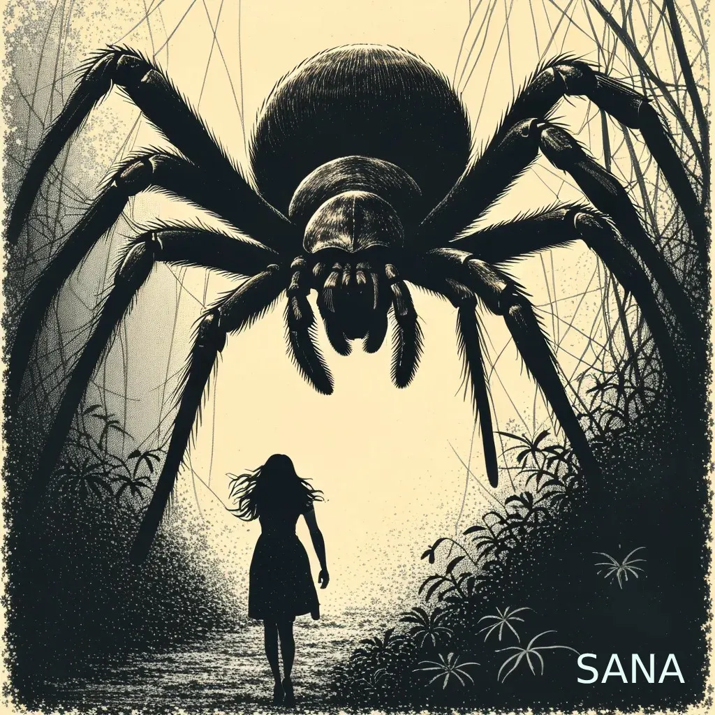 Prompt 1: “Hand-drawn illustration of a giant spider chasing a woman in the jungle, extremely scary, anguish, dark and creepy scenery, horror, hints of analog photography influence, sketch.”