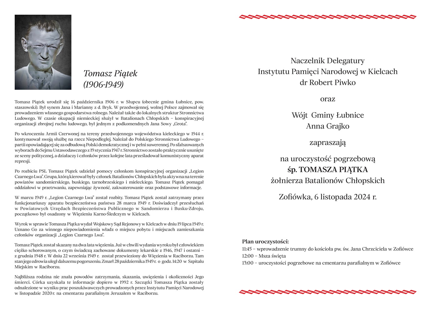 W środę 6 listopada 2024 roku w miejscowości Zofiówka (gm. Łubnice, pow. staszowski) odbędzie się uroczystość pogrzebowa śp. Tomasza Piątka, żołnierza Batalionów Chłopskich. Jego szczątki zostały odnalezione w ramach prac poszukiwawczych prowadzonych przez Instytut Pamięci Narodowej.