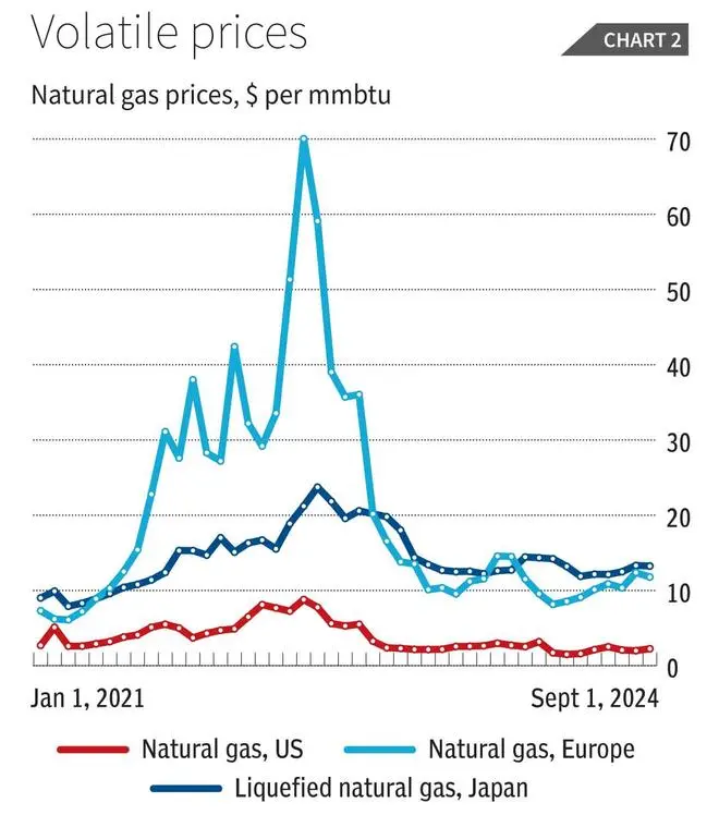 At the start of 2022, prices in Europe were 6.5 times higher than in the US; by July they were eight times higher. Yet even as prices came down in both countries after August 2022, they declined more steeply and rapidly in Europe, such that by January 2024, prices in Europe were only three times higher than in the US. Nevertheless the price difference remains notable, and cannot be explained by transport costs.