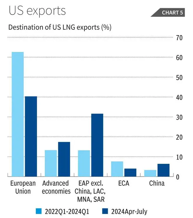 Figure 5 shows that the share of US natural gas exports going to the European Union fell from more than 60 per cent in 2022Q1-2024Q1 to around 40 per cent in the most recently available quarterly data, for 2024Q2. Most of this slack was taken up by the developing regions just mentioned.