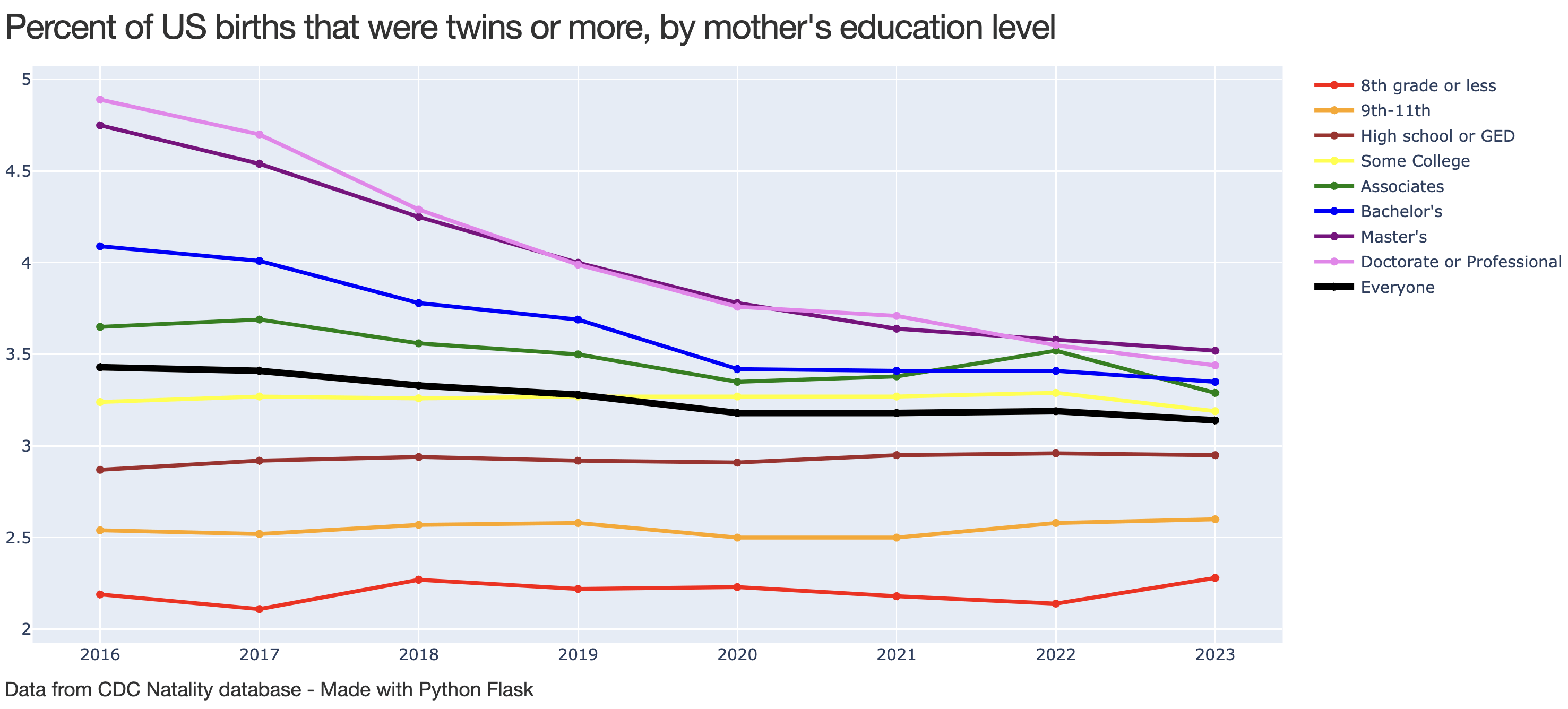 5. Would the education be correlated with income/good health insurance, and thus IVF access (and often higher age when trying to conceive), which can have a higher chance of multiples? The downward trend would also make sense if that’s it, since transferring multiple embryos is not nearly as common as it used to be.