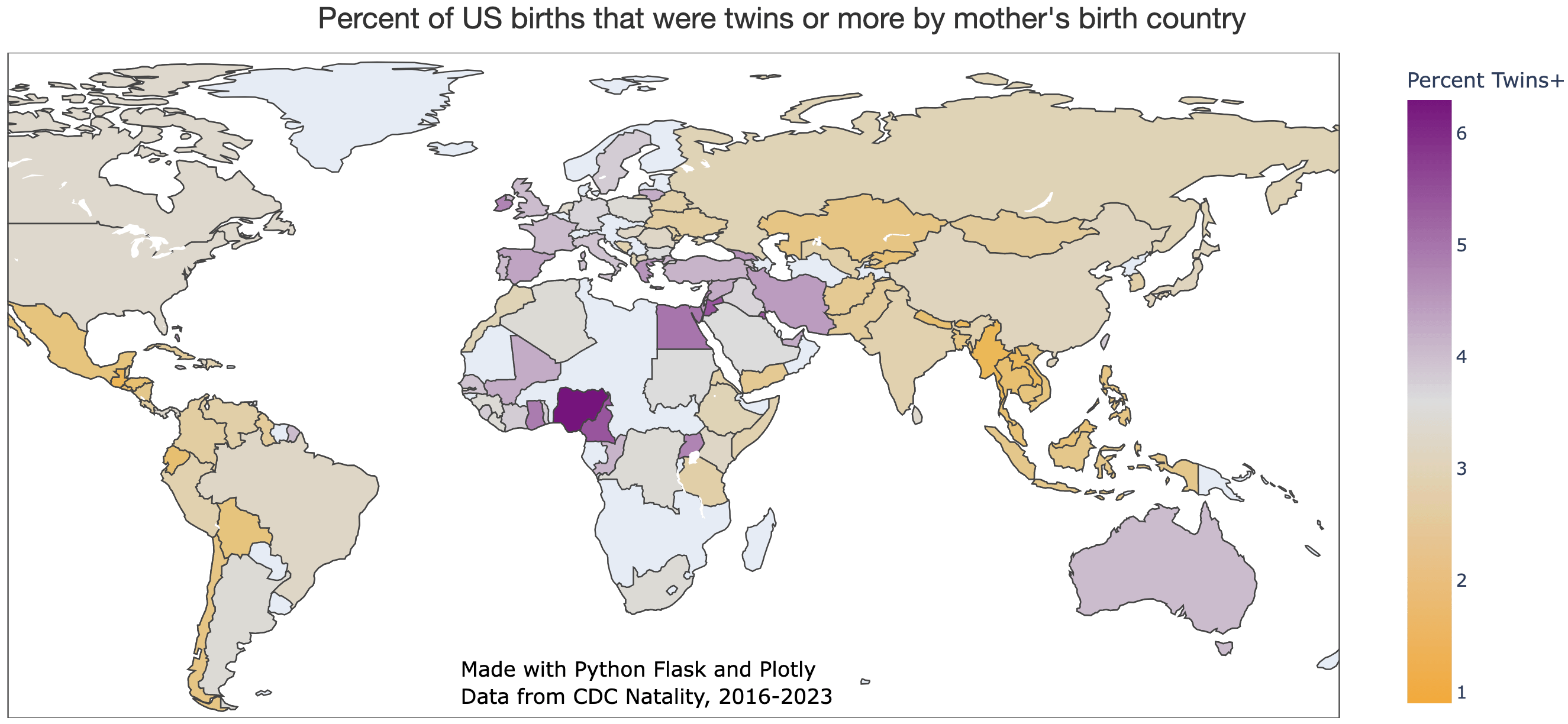 The neutral color at the center of the scale is 3.4%, which is the percentage of twin+ births among US-born mothers.