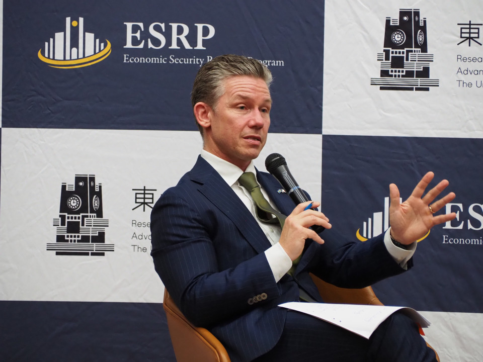 Swedish Defense Minister Pal Jonson speaks at a NATO-Japan symposium at the University of Tokyo on Dec. 3, 2024. (Kyodo)