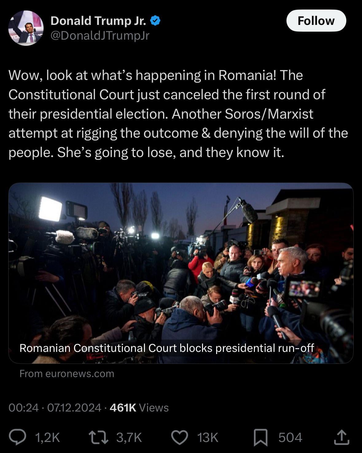 6. Trump Jr is upset his father won’t have an ally in Putin led Romania.