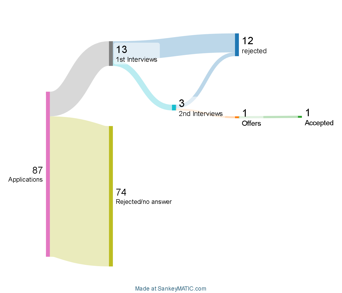 (Source) My own overview of application proccess conducted in excel, Sankey Diagram created using SankeyMATIC (https://sankeymatic.com/build/) (Tool)