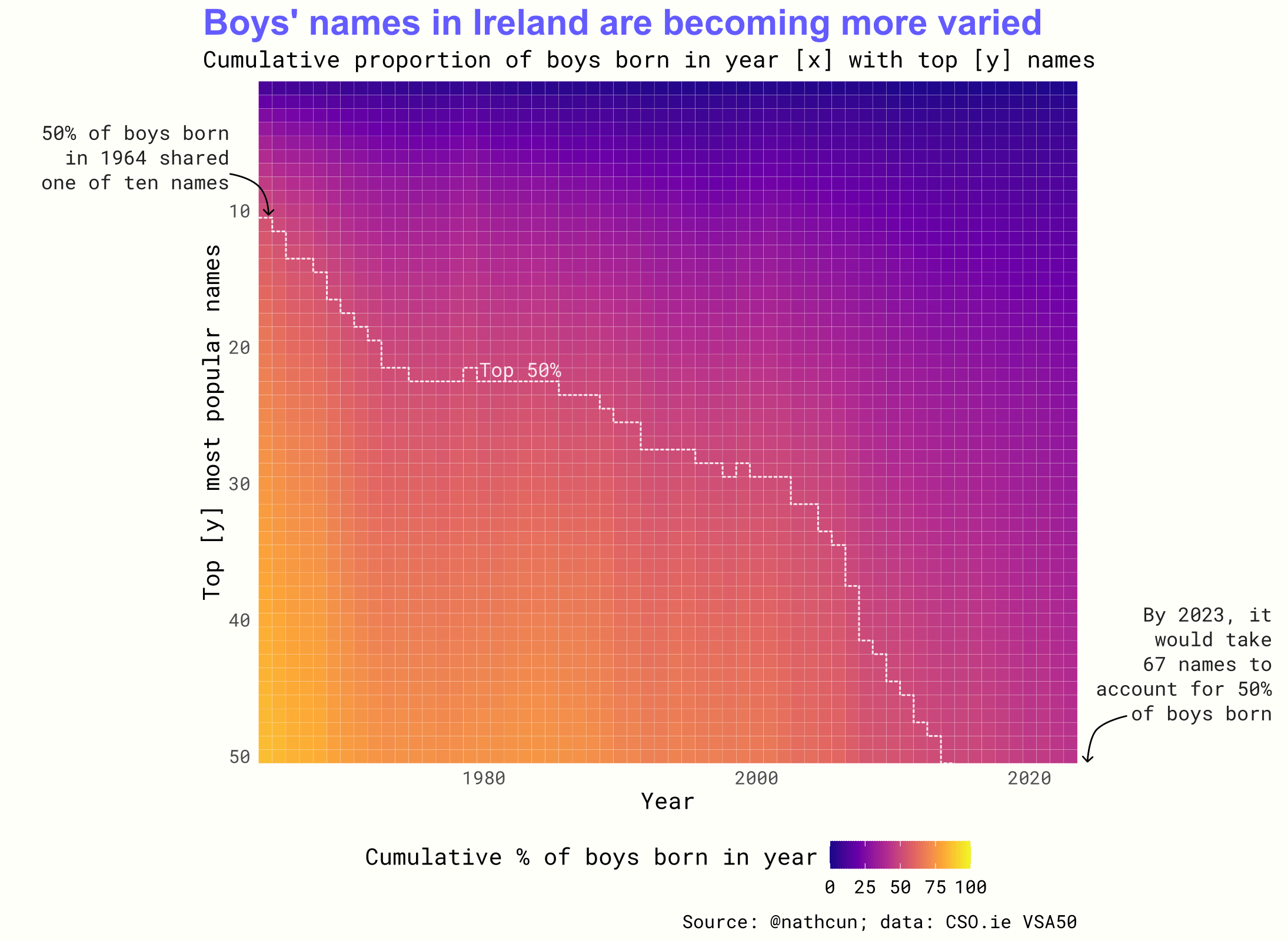 Data source: [www.cso.ie](http://www.cso.ie) VSA50 database of boys names per year with 3 or more occurrences.