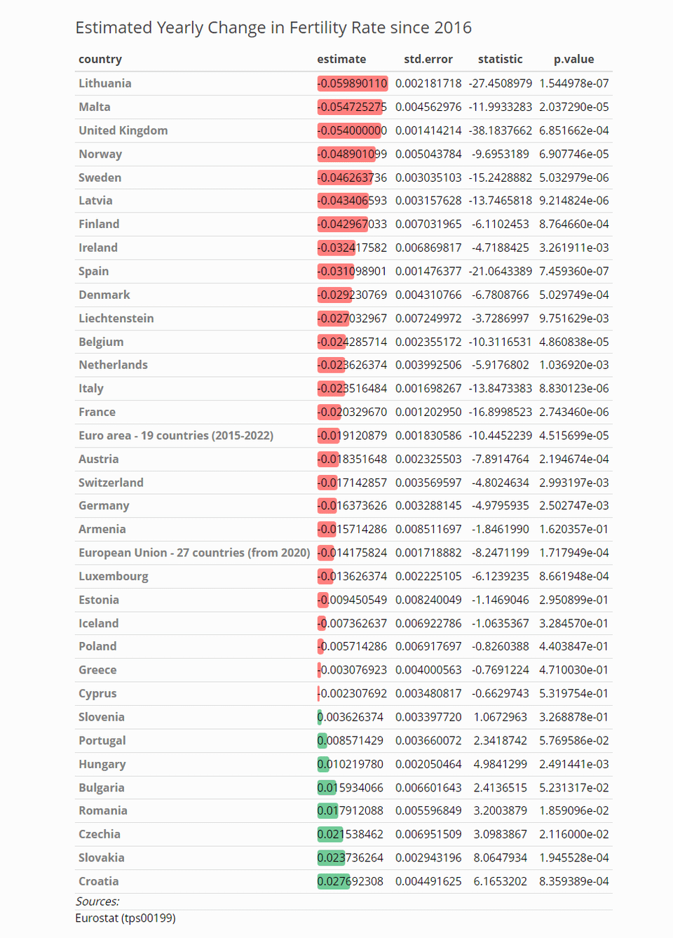 **The inflection point for Lithuanian Fertility Rates seems to have happened in 2016** (and inspecting visually, some other countries as well), and has been on a downward trend ever since, so much so, that **Lithuania had the largest yearly decrease in Fertility Rates since 2016 in the EU.** While at the same time the EU rate pretty level at the same time.