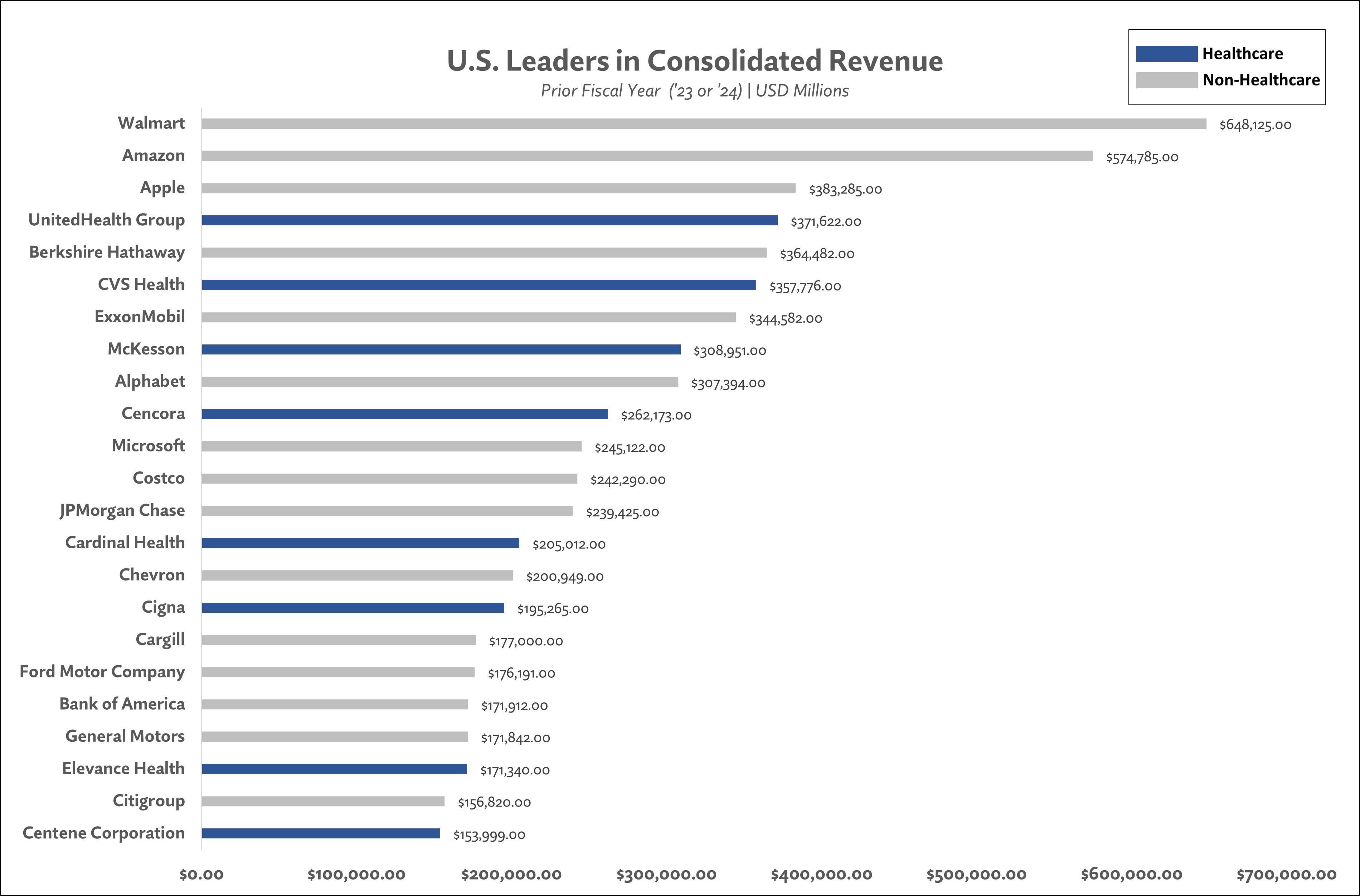 Not a comment on the graph itself – but I wonder if and when Walmart or Amazon will become the first company to hit *$1 trillion* in annual revenue. Though they would have to grow another 60% larger from today to get there.