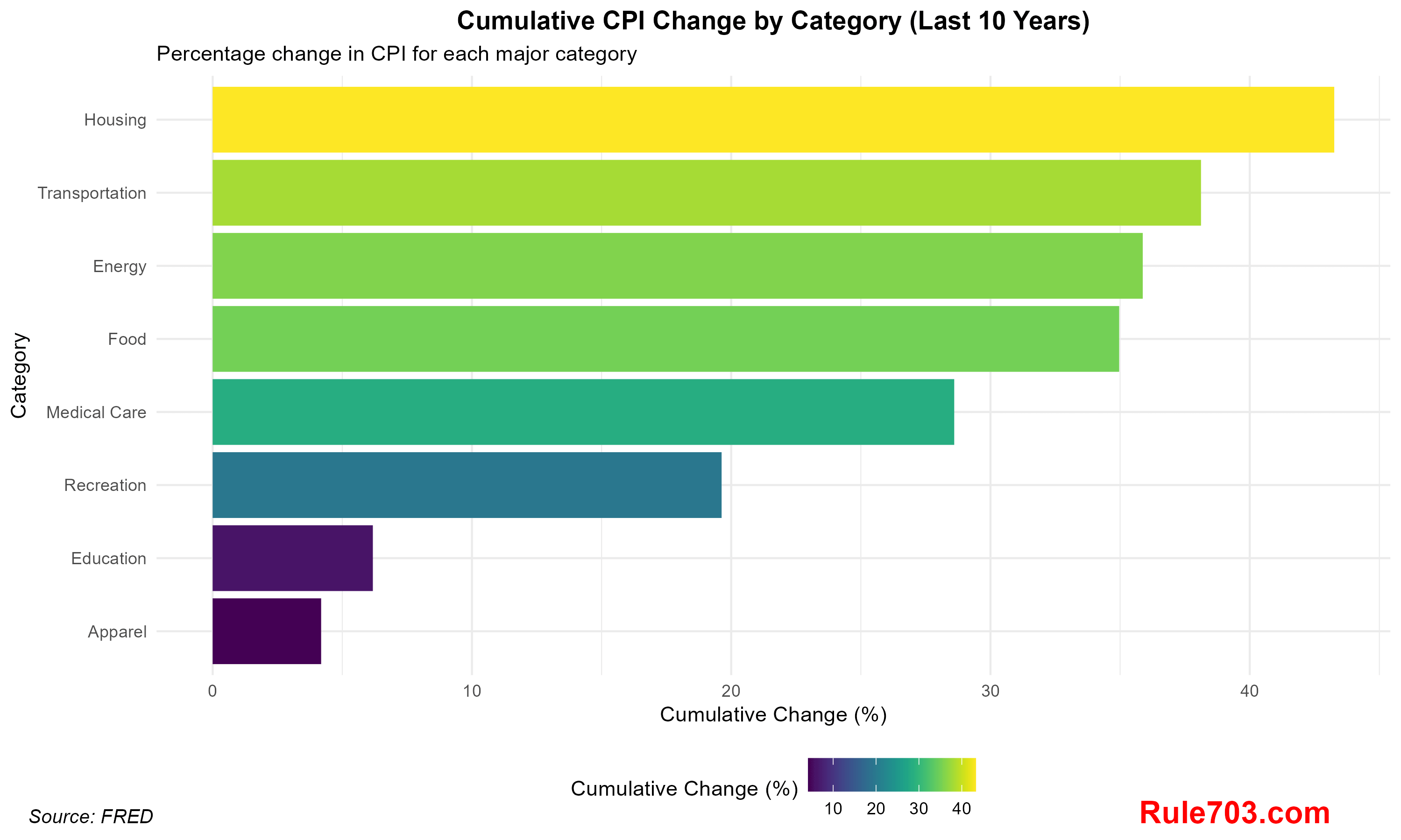 Check out the cumulative percentage change in CPI for major spending categories in the US over the last decade. Data comes from **FRED** via the `fredr` R package, with visualization done using `ggplot2` and `viridis`. Housing and transportation have seen the highest inflation, while apparel has remained relatively stable.