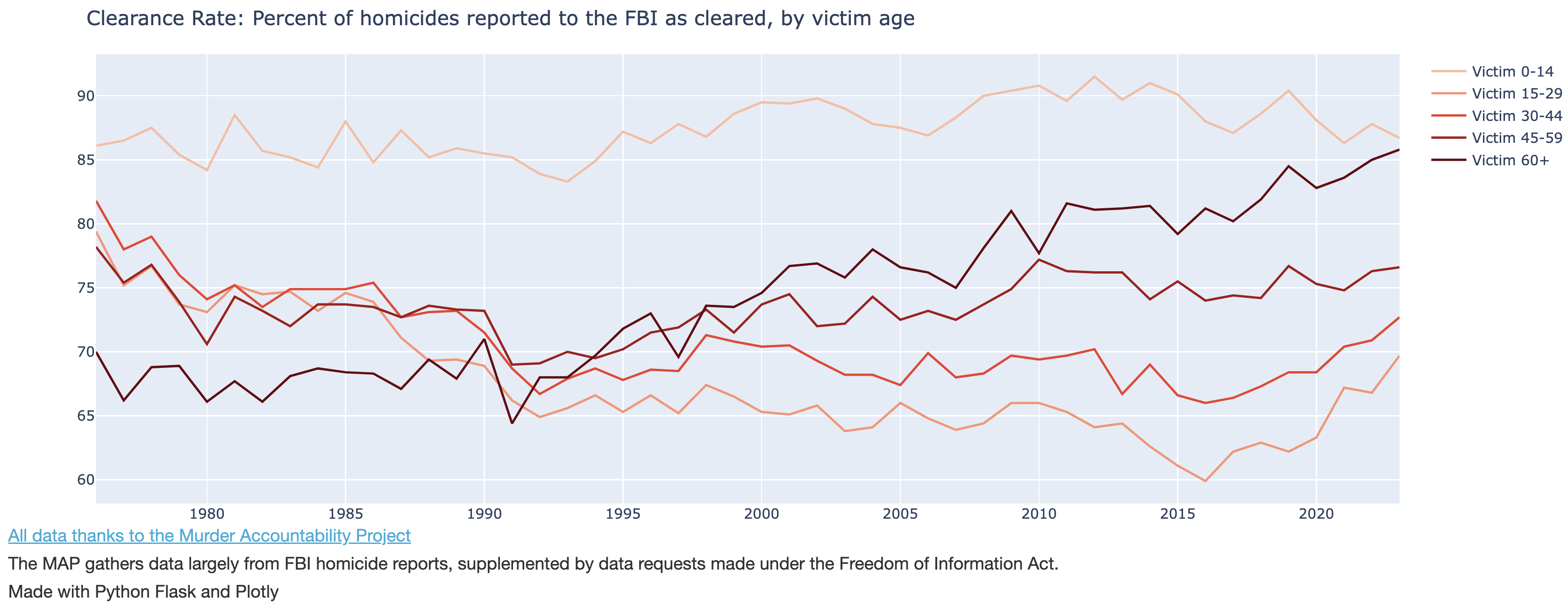 [OC] Trends in homicide clearance, by age of victim