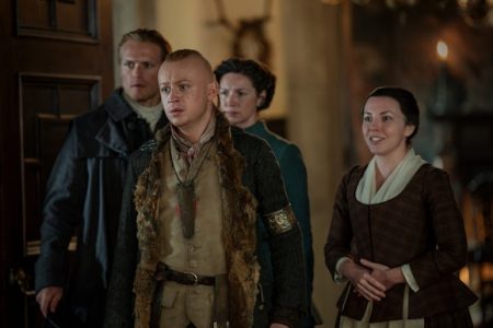 Outlander_709_Unfinished Business_Left to Right: Sam Heughan (“Jamie Fraser”), John Bell (“Young Ian”), Caitríona Balfe (“Claire Fraser”), and Kristin Atherton (“Jenny Fraser”)
