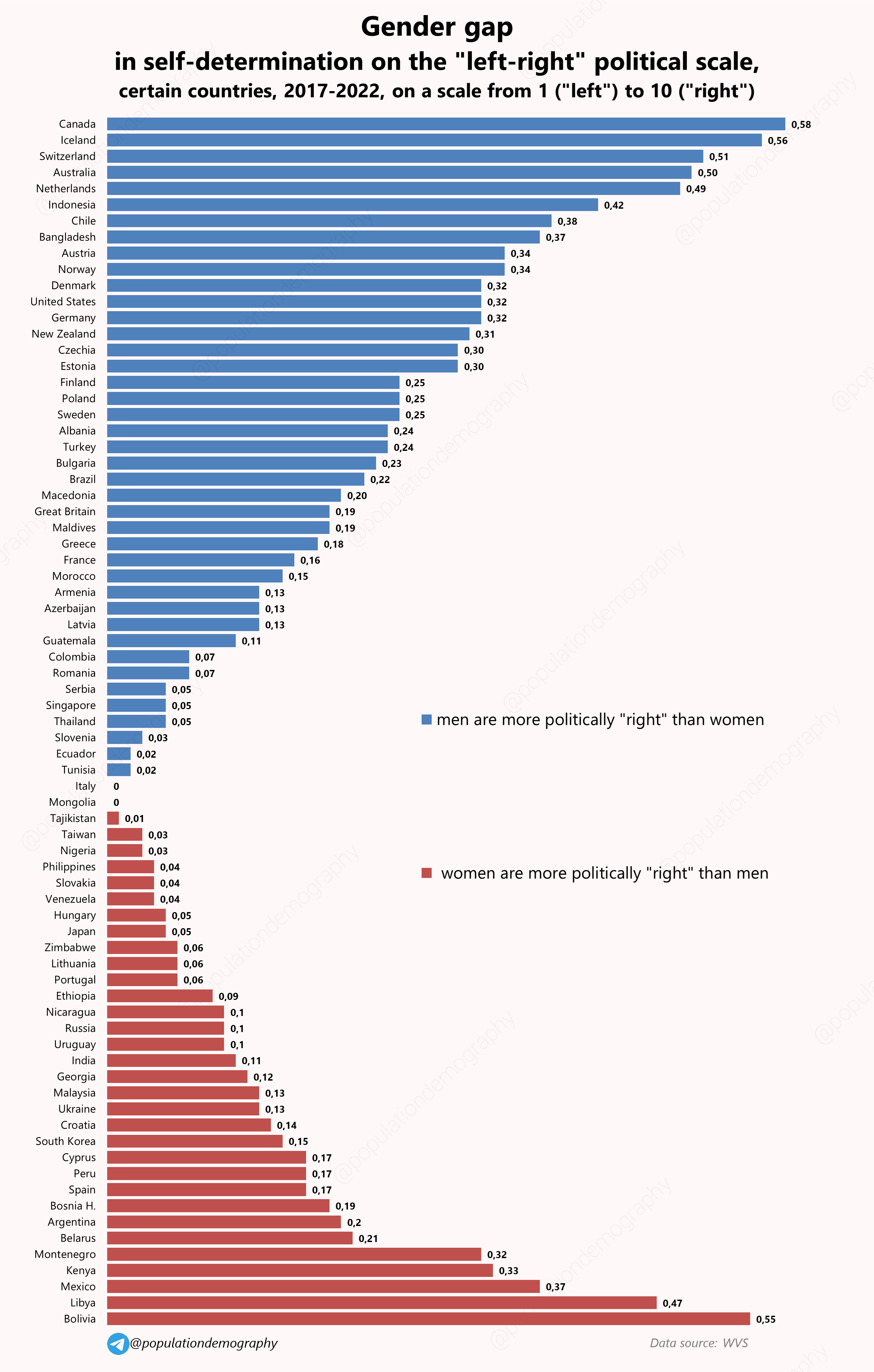 Gender gap (male – female difference) in self-determination on the “left-right” political scale, certain countries, 2017-2022, on a scale from 1 (“left”) to 10 (“right”) [OC]