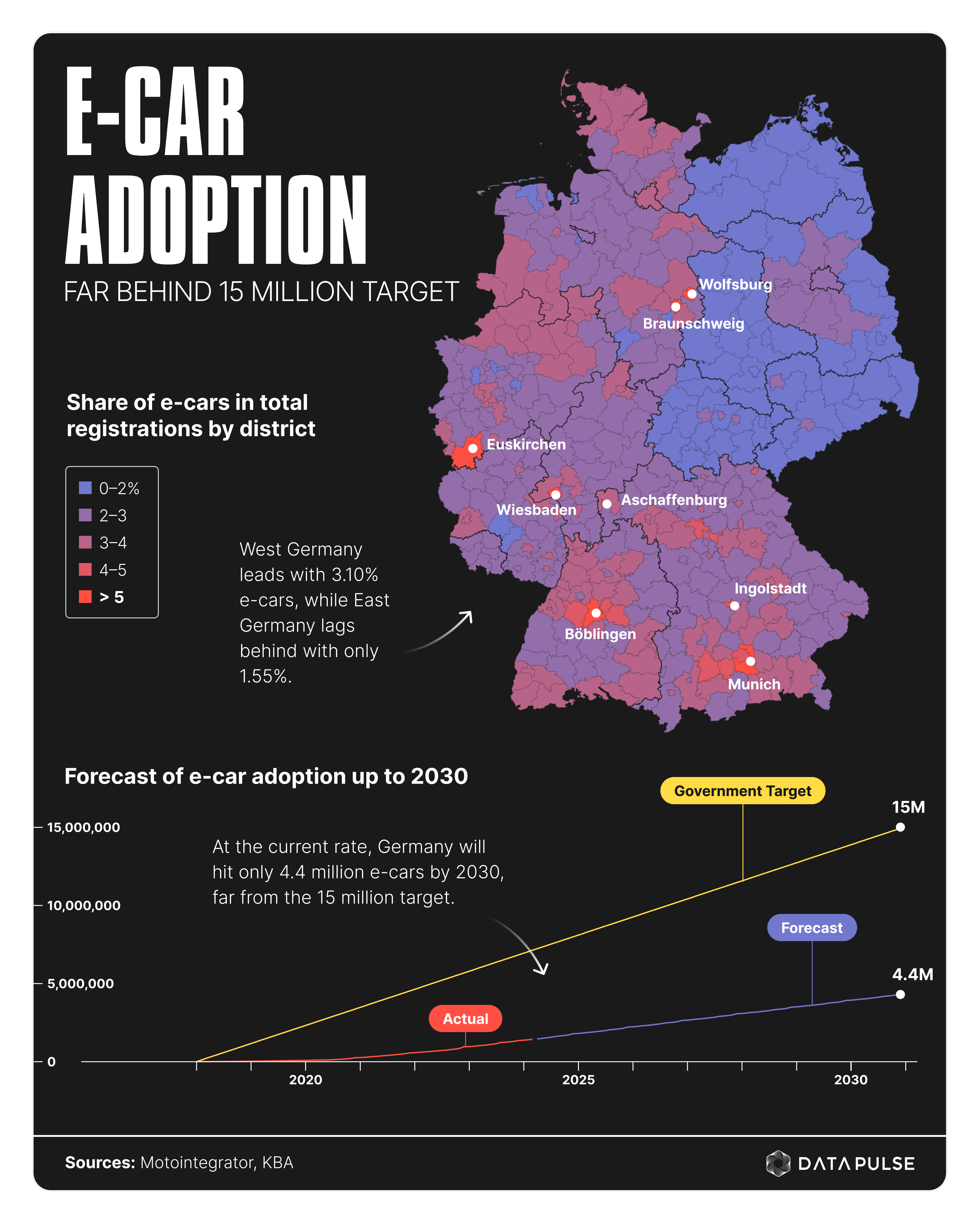 The mobility transition in Germany is in crisis: although more than 1.4 million electric cars were registered in 2024, the ambitious target of 15 million electric cars by 2030 is a long way off. A recent analysis by Motointegrator shows that the actual forecast for 2030 is around 4.4 million vehicles – less than a third of the target.